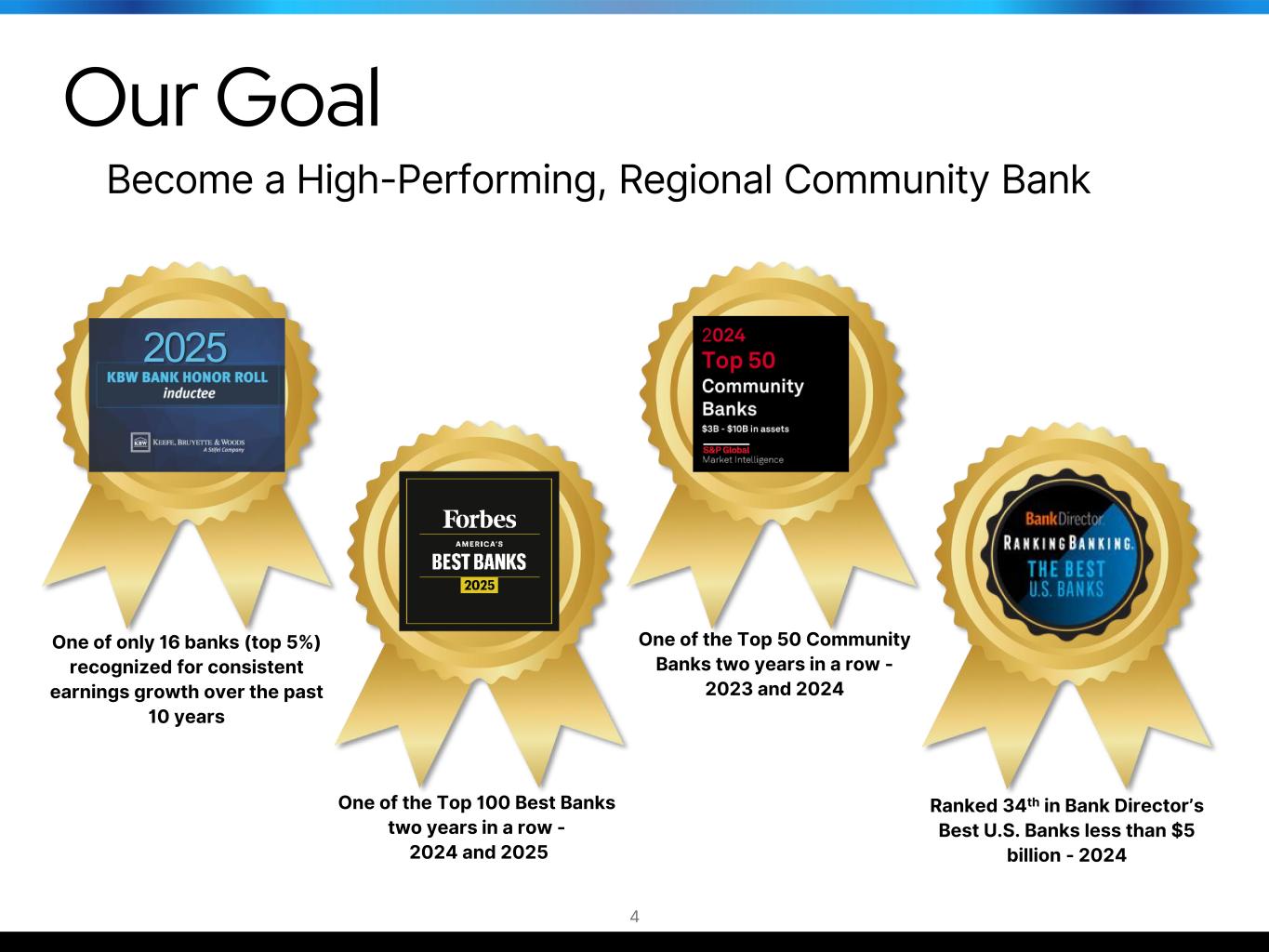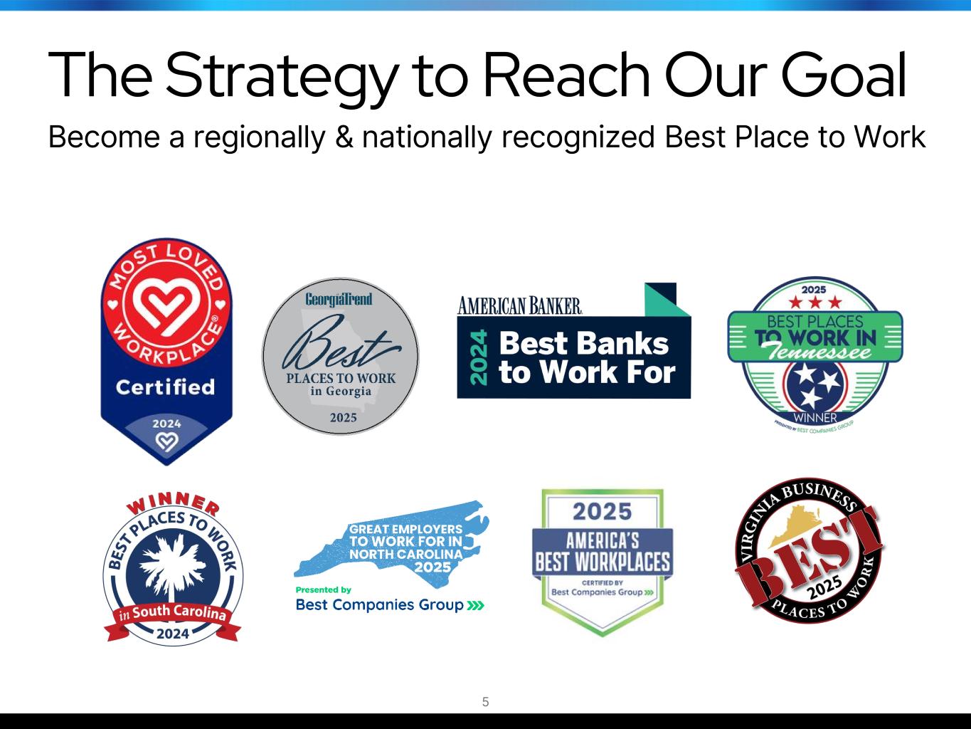 One of the Top 50 Community Banks two years in a row - 2023 and 2024 One of the Top 100 Best Banks two years in a row - 2024 and 2025 Ranked 34th in Bank Director’s Best U.S. Banks less than $5 billion - 2024 4 Our Goal Become a High-Performing, Regional Community Bank One of only 16 banks (top 5%) recognized for consistent earnings growth over the past 10 years 2025