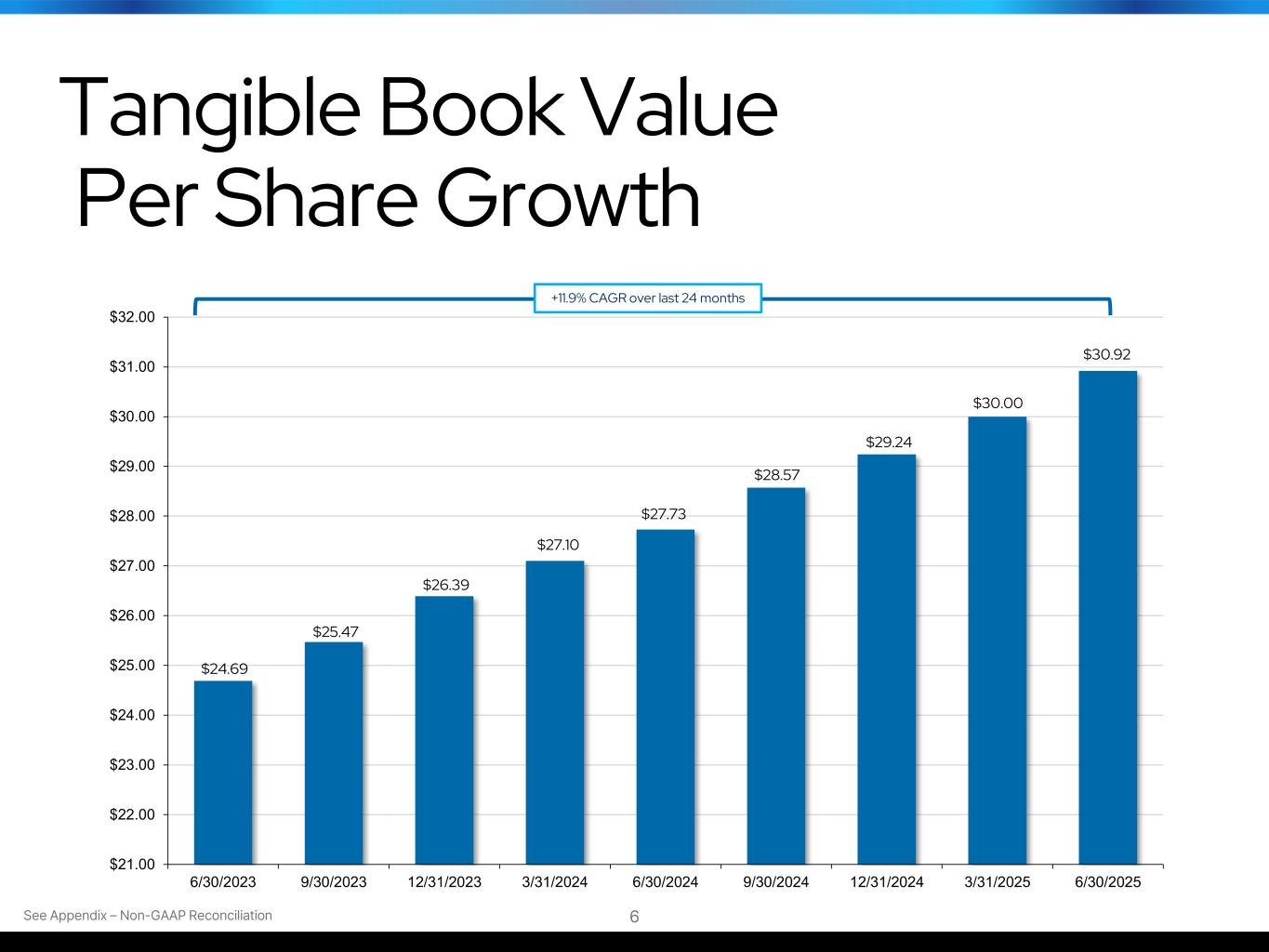 $24.69 $25.47 $26.39 $27.10 $27.73 $28.57 $29.24 $30.00 $30.92 $21.00 $22.00 $23.00 $24.00 $25.00 $26.00 $27.00 $28.00 $29.00 $30.00 $31.00 $32.00 6/30/2023 9/30/2023 12/31/2023 3/31/2024 6/30/2024 9/30/2024 12/31/2024 3/31/2025 6/30/2025 See Appendix – Non-GAAP Reconciliation Tangible Book Value Per Share Growth +11.9% CAGR over last 24 months 6