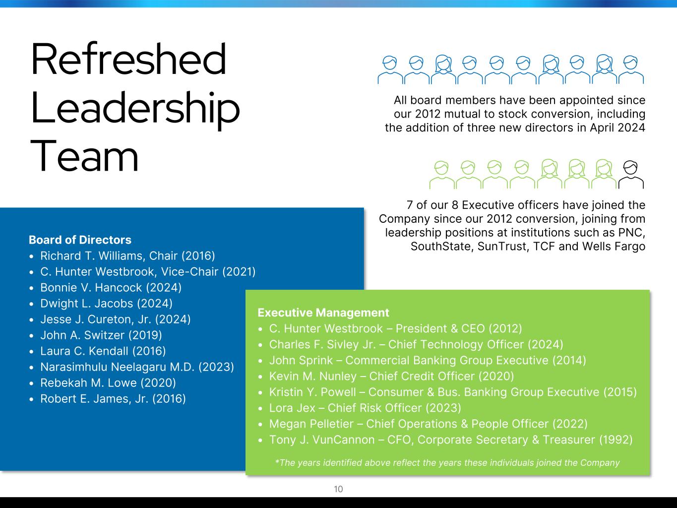Refreshed Leadership Team Executive Management • C. Hunter Westbrook – President & CEO (2012) • Charles F. Sivley Jr. – Chief Technology Officer (2024) • John Sprink – Commercial Banking Group Executive (2014) • Kevin M. Nunley – Chief Credit Officer (2020) • Kristin Y. Powell – Consumer & Bus. Banking Group Executive (2015) • Lora Jex – Chief Risk Officer (2023) • Megan Pelletier – Chief Operations & People Officer (2022) • Tony J. VunCannon – CFO, Corporate Secretary & Treasurer (1992) Board of Directors • Richard T. Williams, Chair (2016) • C. Hunter Westbrook, Vice-Chair (2021) • Bonnie V. Hancock (2024) • Dwight L. Jacobs (2024) • Jesse J. Cureton, Jr. (2024) • John A. Switzer (2019) • Laura C. Kendall (2016) • Narasimhulu Neelagaru M.D. (2023) • Rebekah M. Lowe (2020) • Robert E. James, Jr. (2016) *The years identified above reflect the years these individuals joined the Company 7 of our 8 Executive officers have joined the Company since our 2012 conversion, joining from leadership positions at institutions such as PNC, SouthState, SunTrust, TCF and Wells Fargo All board members have been appointed since our 2012 mutual to stock conversion, including the addition of three new directors in April 2024 10