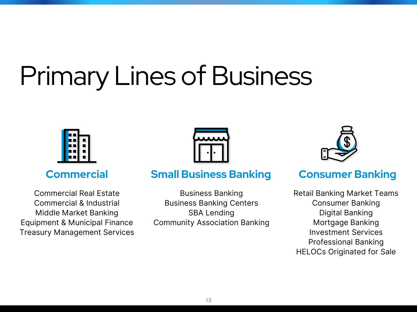 Business Banking Business Banking Centers SBA Lending Community Association Banking Small Business Banking Consumer Banking Commercial Commercial Real Estate Commercial & Industrial Middle Market Banking Equipment & Municipal Finance Treasury Management Services Retail Banking Market Teams Consumer Banking Digital Banking Mortgage Banking Investment Services Professional Banking HELOCs Originated for Sale Primary Lines of Business 13
