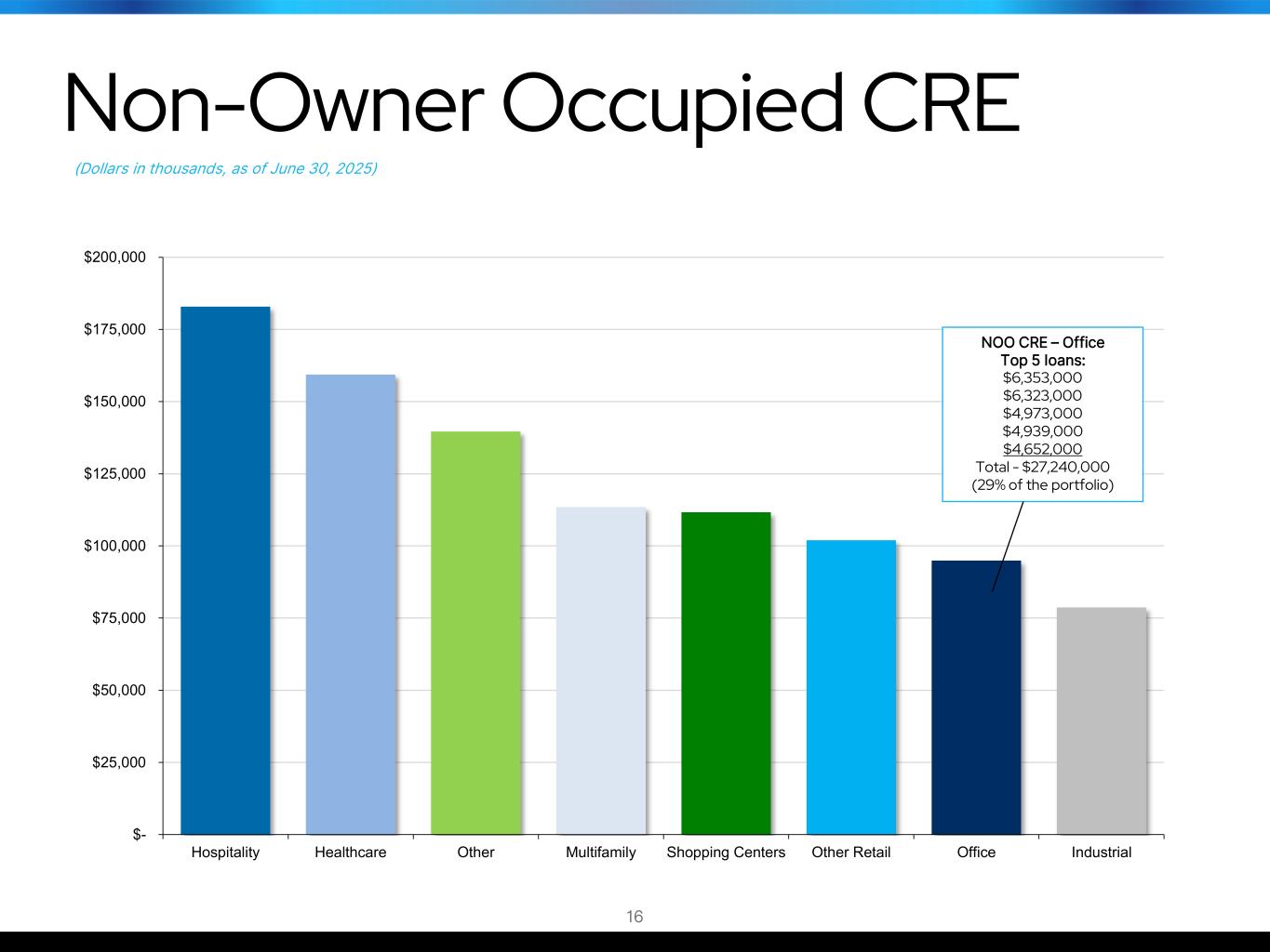 Commercial RE (NOO) 27% Commercial RE (OO) 15% Construction and Development 9% Other Commercial 15% Equipment Finance 10% 1-4 Family 17% HELOCs and Other Consumer 7% Diversified Loan Portfolio 15 Total Loans $3,671,951 (Dollars in thousands, as of June 30, 2025) With Low Concentration Risk