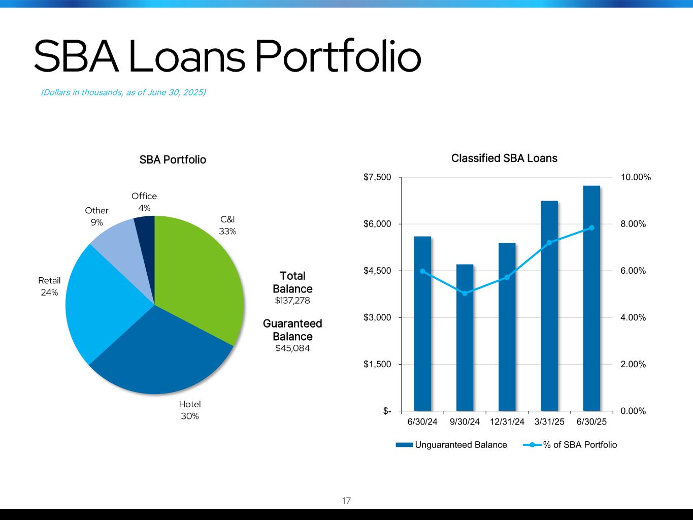 $- $25,000 $50,000 $75,000 $100,000 $125,000 $150,000 $175,000 $200,000 Hospitality Healthcare Other Multifamily Shopping Centers Other Retail Office Industrial Non-Owner Occupied CRE NOO CRE – Office Top 5 loans: $6,353,000 $6,323,000 $4,973,000 $4,939,000 $4,652,000 Total - $27,240,000 (29% of the portfolio) 16 (Dollars in thousands, as of June 30, 2025)