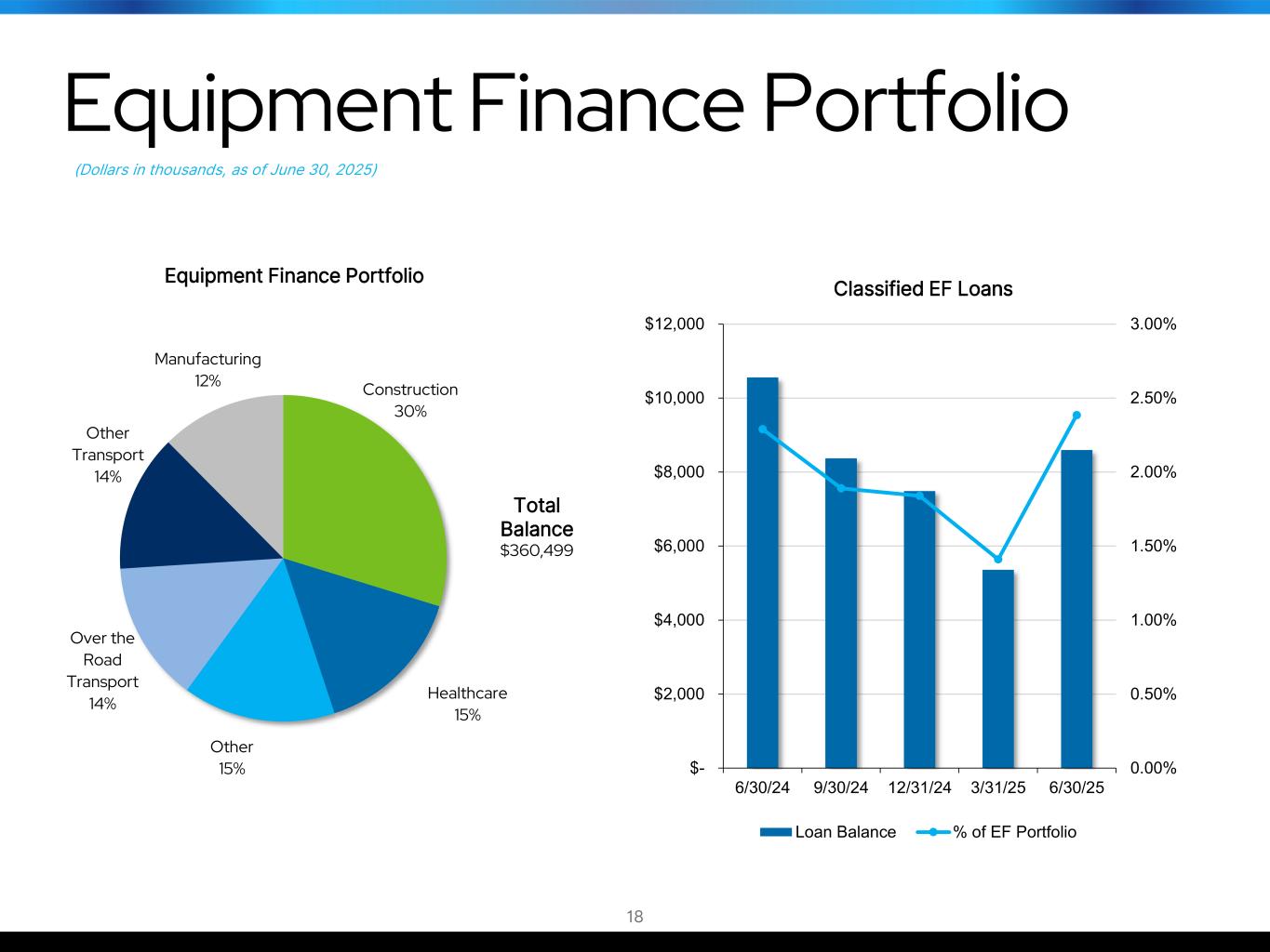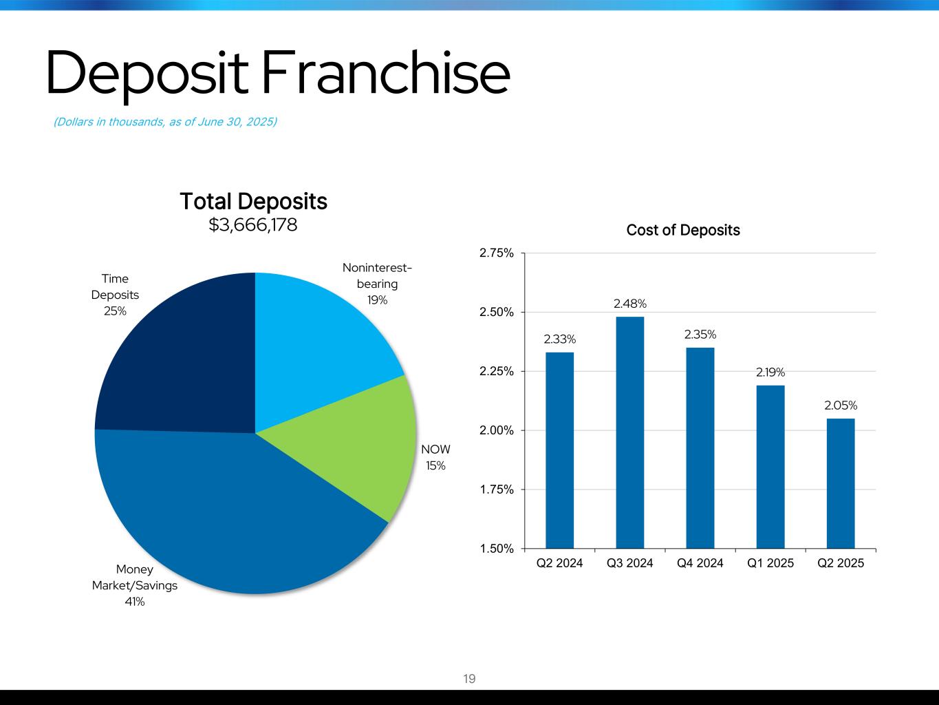 0.00% 0.50% 1.00% 1.50% 2.00% 2.50% 3.00% $- $2,000 $4,000 $6,000 $8,000 $10,000 $12,000 6/30/24 9/30/24 12/31/24 3/31/25 6/30/25 Classified EF Loans Loan Balance % of EF Portfolio 18 Equipment Finance Portfolio (Dollars in thousands, as of June 30, 2025) Construction 30% Healthcare 15% Other 15% Over the Road Transport 14% Other Transport 14% Manufacturing 12% Equipment Finance Portfolio Total Balance $360,499