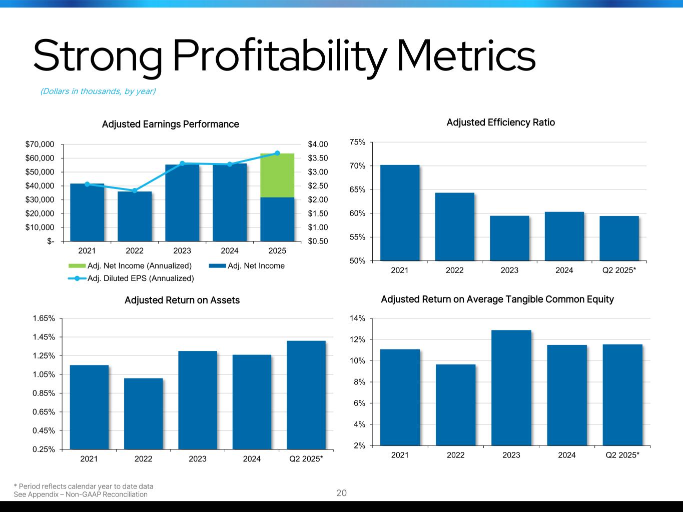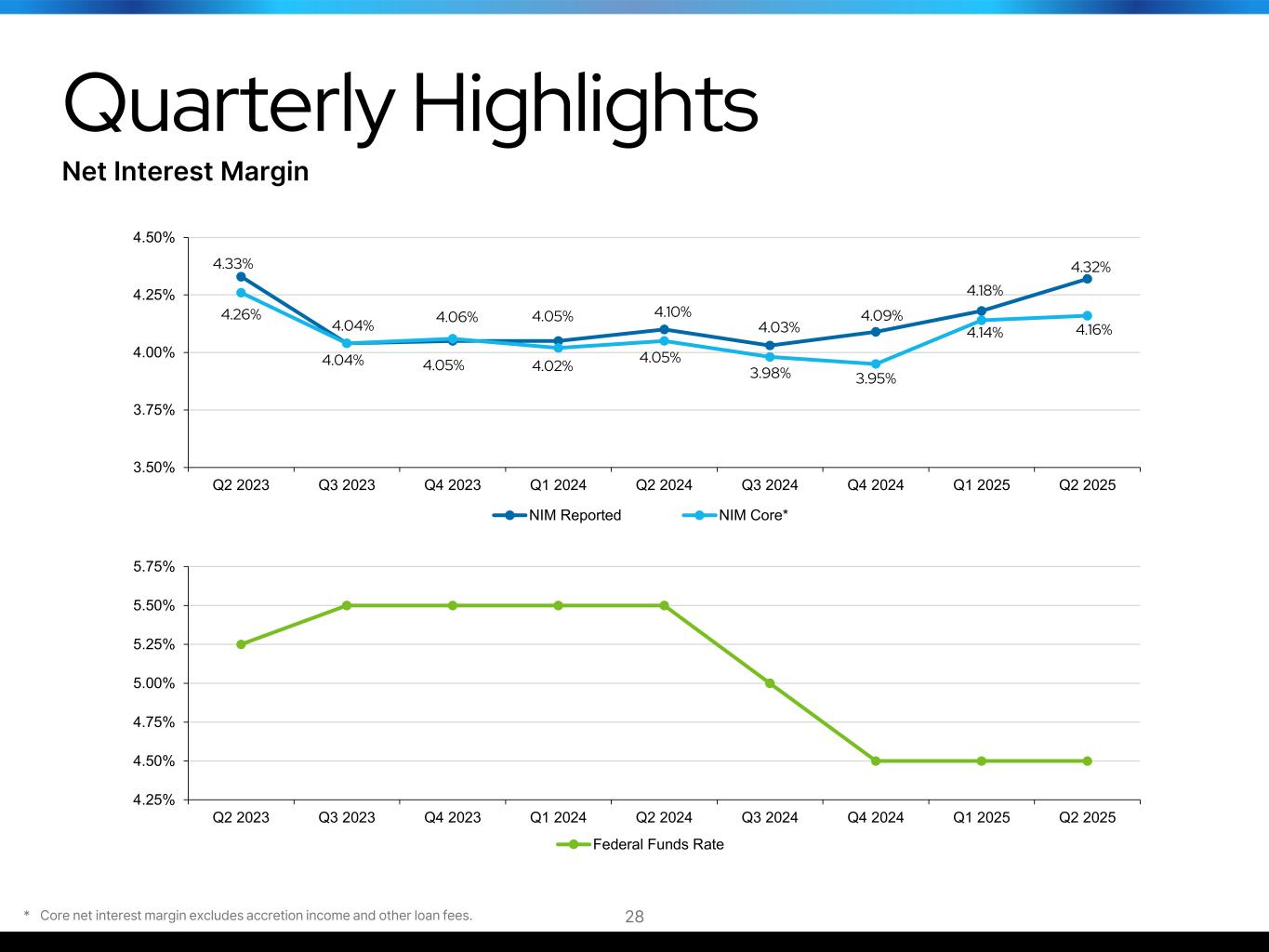Quarterly Highlights Net Income Per Share 6/30/2025 3/31/2025 12/31/2024 9/30/2024 6/30/2024 3/31/2024 Basic $ 1.01 $ 0.84 $ 0.83 $ 0.77 $ 0.73 $ 0.88 Diluted $ 1.00 $ 0.84 $ 0.83 $ 0.76 $ 0.73 $ 0.88 See Appendix – Non-GAAP Reconciliation Performance Ratios 6/30/2025 3/31/2025 12/31/2024 9/30/2024 6/30/2024 3/31/2024 Return on assets (ROA) 1.58 % 1.33 % 1.27 % 1.17 % 1.13 % 1.37 % Return on equity (ROE) 11.97 % 10.52 % 10.32 % 9.76 % 9.58 % 11.91 % Yield on earning assets 6.22 % 6.20 % 6.27 % 6.34 % 6.32 % 6.18 % Rate paid on interest-bearing liabilities 2.61 % 2.73 % 2.94 % 3.09 % 3.01 % 2.87% Net interest margin 4.32 % 4.18 % 4.09 % 4.03 % 4.10 % 4.05 % Efficiency ratio - adjusted 58.59 % 60.29 % 59.89 % 60.52 % 59.89 % 60.85 % Asset Quality Ratios 6/30/2025 3/31/2025 12/31/2024 9/30/2024 6/30/2024 3/31/2024 Nonperforming assets to total assets 0.67 % 0.61 % 0.63 % 0.64 % 0.54 % 0.43 % Nonperforming loans to total loans 0.81 % 0.74 % 0.76 % 0.78 % 0.68 % 0.55 % Classified assets to total assets 1.07 % 0.85 % 1.06 % 0.99 % 0.91 % 0.80 % ACL to nonperforming loans 147.98 % 165.96 % 163.68 % 166.51 % 194.80 % 235.18 % ACL to total loans 1.20 % 1.23 % 1.24 % 1.30 % 1.33 % 1.30 % Net charge-offs to average loans 0.21 % 0.14 % 0.19 % 0.42 % 0.27 % 0.24 % 27