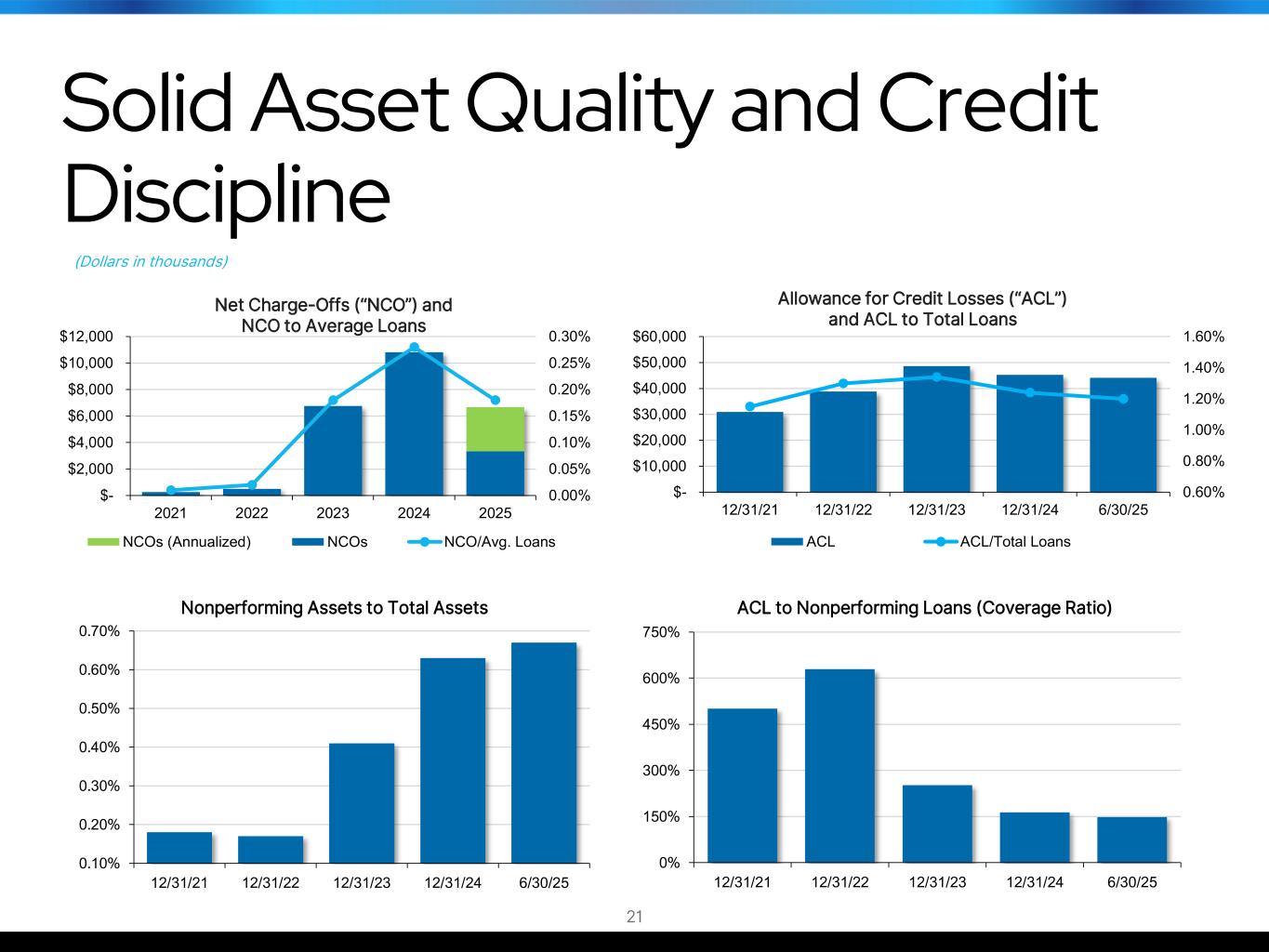 Strong Profitability Metrics (Dollars in thousands, by year) $0.50 $1.00 $1.50 $2.00 $2.50 $3.00 $3.50 $4.00 $- $10,000 $20,000 $30,000 $40,000 $50,000 $60,000 $70,000 2021 2022 2023 2024 2025 Adjusted Earnings Performance Adj. Net Income (Annualized) Adj. Net Income Adj. Diluted EPS (Annualized) 0.25% 0.45% 0.65% 0.85% 1.05% 1.25% 1.45% 1.65% 2021 2022 2023 2024 Q2 2025* Adjusted Return on Assets 50% 55% 60% 65% 70% 75% 2021 2022 2023 2024 Q2 2025* Adjusted Efficiency Ratio 2% 4% 6% 8% 10% 12% 14% 2021 2022 2023 2024 Q2 2025* Adjusted Return on Average Tangible Common Equity * Period reflects calendar year to date data See Appendix – Non-GAAP Reconciliation 20