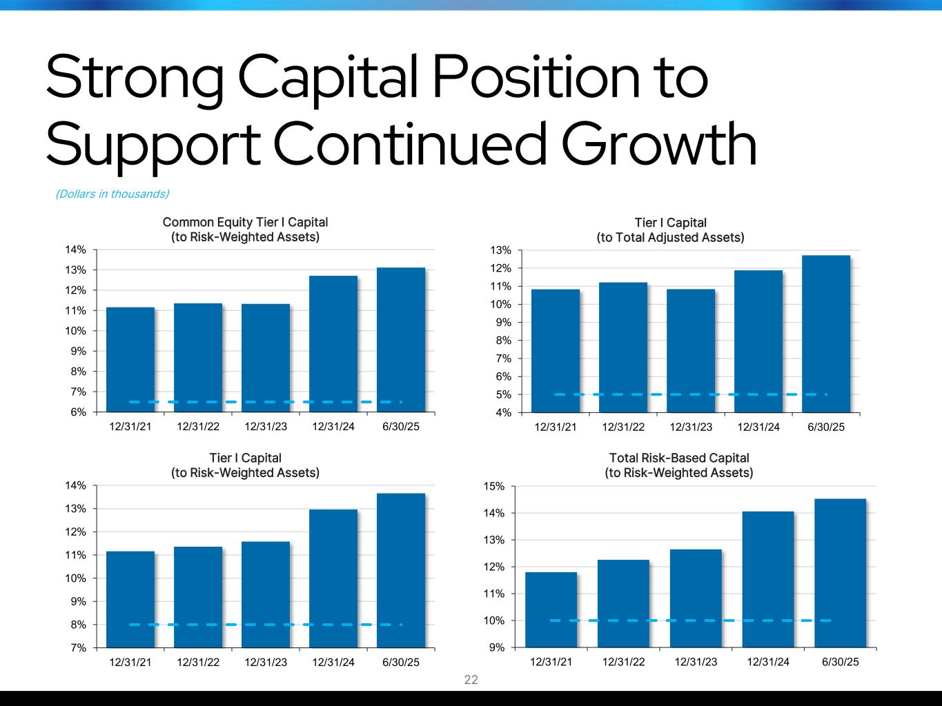 Strong Capital Position to Support Continued Growth (Dollars in thousands) 7% 8% 9% 10% 11% 12% 13% 14% 12/31/21 12/31/22 12/31/23 12/31/24 6/30/25 Tier I Capital (to Risk-Weighted Assets) 9% 10% 11% 12% 13% 14% 15% 12/31/21 12/31/22 12/31/23 12/31/24 6/30/25 Total Risk-Based Capital (to Risk-Weighted Assets) 6% 7% 8% 9% 10% 11% 12% 13% 14% 12/31/21 12/31/22 12/31/23 12/31/24 6/30/25 Common Equity Tier I Capital (to Risk-Weighted Assets) 4% 5% 6% 7% 8% 9% 10% 11% 12% 13% 12/31/21 12/31/22 12/31/23 12/31/24 6/30/25 Tier I Capital (to Total Adjusted Assets) 22