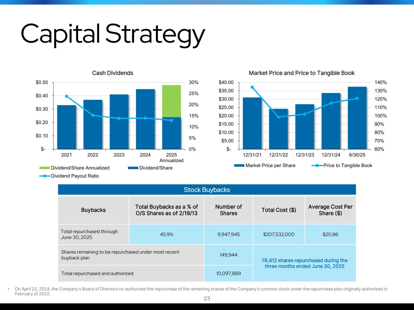 Capital Strategy 0% 5% 10% 15% 20% 25% 30% $- $0.10 $0.20 $0.30 $0.40 $0.50 2021 2022 2023 2024 2025 Annualized Cash Dividends Dividend/Share Annualized Dividend/Share Dividend Payout Ratio 60% 70% 80% 90% 100% 110% 120% 130% 140% $- $5.00 $10.00 $15.00 $20.00 $25.00 $30.00 $35.00 $40.00 12/31/21 12/31/22 12/31/23 12/31/24 6/30/25 Market Price and Price to Tangible Book Market Price per Share Price to Tangible Book Stock Buybacks Buybacks Total Buybacks as a % of O/S Shares as of 2/19/13 Number of Shares Total Cost ($) Average Cost Per Share ($) Total repurchased through June 30, 2025 45.9% 9,947,945 $207,532,000 $20.86 Shares remaining to be repurchased under most recent buyback plan 149,944 78,412 shares repurchased during the three months ended June 30, 2025 Total repurchased and authorized 10,097,889 • On April 22, 2024, the Company's Board of Directors re-authorized the repurchase of the remaining shares of the Company’s common stock under the repurchase plan originally authorized in February of 2022. 23