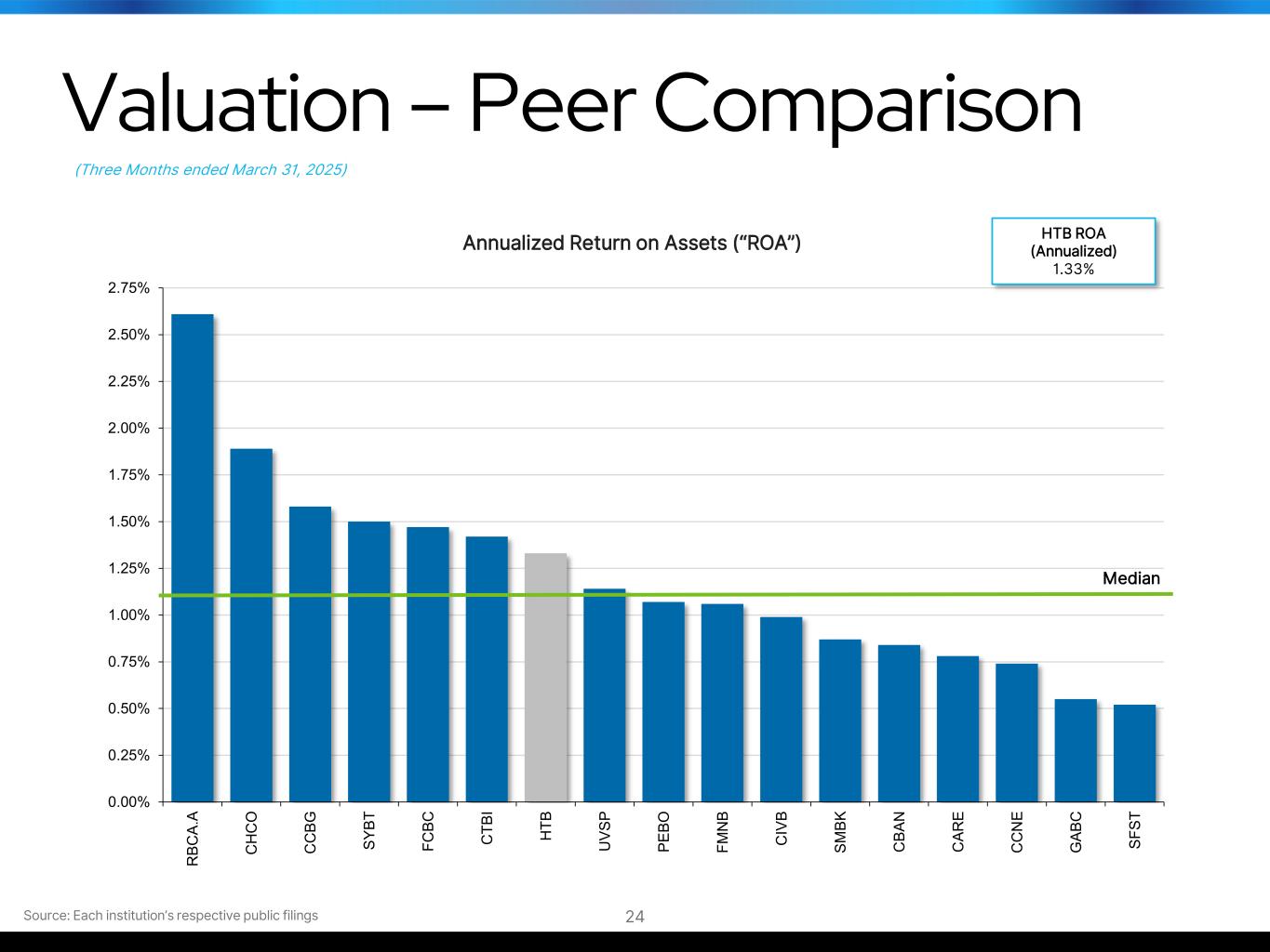 0.00% 0.25% 0.50% 0.75% 1.00% 1.25% 1.50% 1.75% 2.00% 2.25% 2.50% 2.75% R B C A .A C H C O C C B G S Y B T F C B C C T B I H T B U V S P P E B O F M N B C IV B S M B K C B A N C A R E C C N E G A B C S F S T Annualized Return on Assets (“ROA”) (Three Months ended March 31, 2025) Valuation – Peer Comparison HTB ROA (Annualized) 1.33% Median Source: Each institution’s respective public filings 24