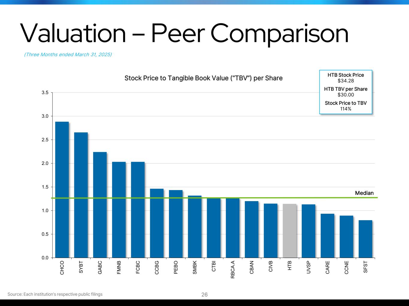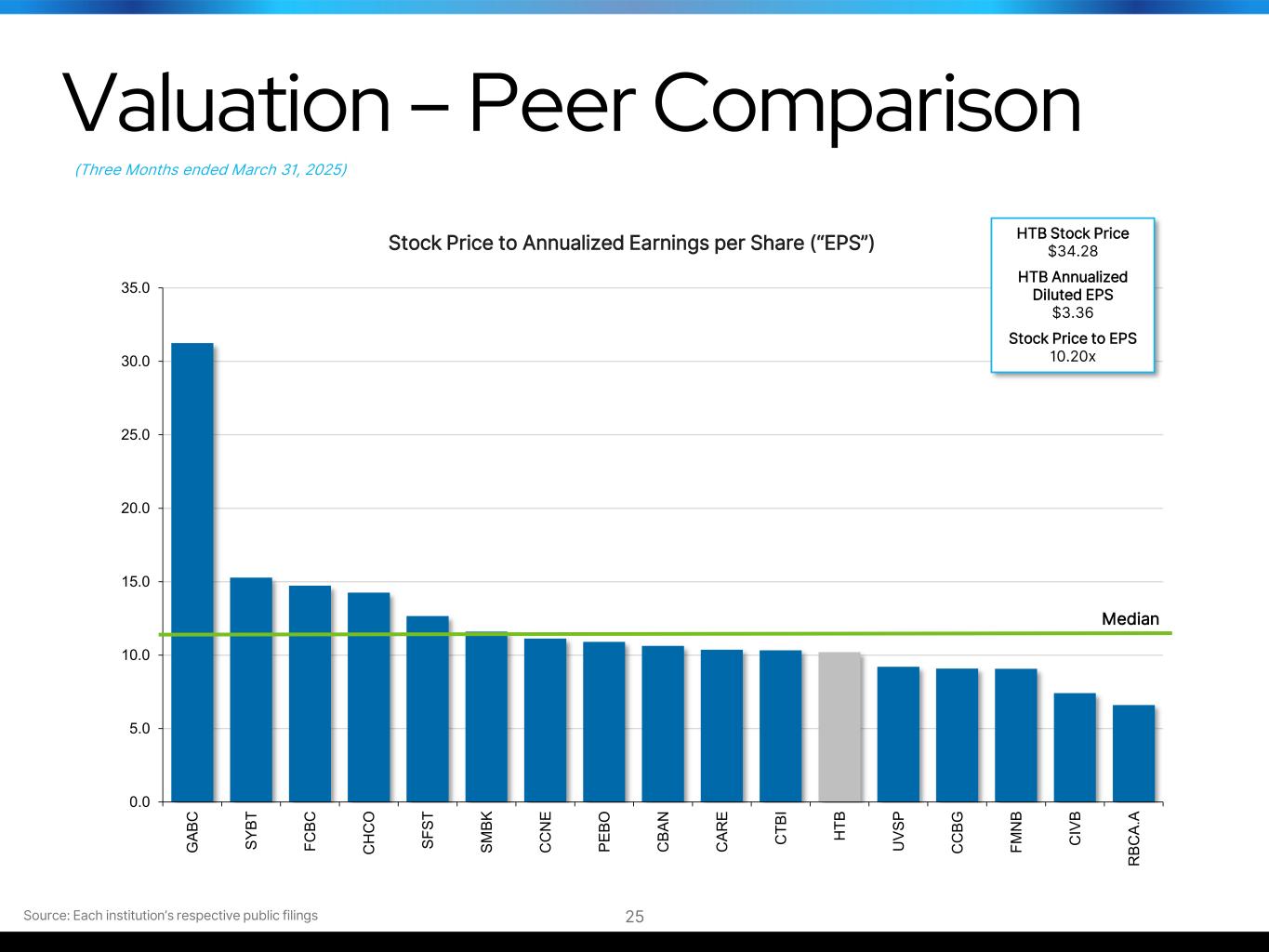 0.0 0.5 1.0 1.5 2.0 2.5 3.0 3.5 C H C O S Y B T G A B C F M N B F C B C C C B G P E B O S M B K C T B I R B C A .A C B A N C IV B H T B U V S P C A R E C C N E S F S T Stock Price to Tangible Book Value (“TBV”) per Share (Three Months ended March 31, 2025) Valuation – Peer Comparison Source: Each institution’s respective public filings HTB Stock Price $34.28 HTB TBV per Share $30.00 Stock Price to TBV 114% Median 26