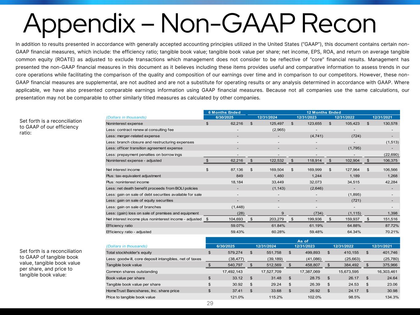 Appendix – Non-GAAP Recon In addition to results presented in accordance with generally accepted accounting principles utilized in the United States (“GAAP”), this document contains certain non- GAAP financial measures, which include: the efficiency ratio; tangible book value; tangible book value per share; net income, EPS, ROA, and return on average tangible common equity (ROATE) as adjusted to exclude transactions which management does not consider to be reflective of “core” financial results. Management has presented the non-GAAP financial measures in this document as it believes including these items provides useful and comparative information to assess trends in our core operations while facilitating the comparison of the quality and composition of our earnings over time and in comparison to our competitors. However, these non- GAAP financial measures are supplemental, are not audited and are not a substitute for operating results or any analysis determined in accordance with GAAP. Where applicable, we have also presented comparable earnings information using GAAP financial measures. Because not all companies use the same calculations, our presentation may not be comparable to other similarly titled measures as calculated by other companies. 6 Months Ended (Dollars in thousands) 6/30/2025 12/31/2024 12/31/2023 12/31/2022 12/31/2021 Noninterest expense 62,216$ 125,497$ 123,655$ 105,423$ 130,578$ Less: contract renew al consulting fee - (2,965) - - - Less: merger-related expense - - (4,741) (724) - Less: branch closure and restructuring expenses - - - - (1,513) Less: off icer transition agreement expense - - - (1,795) - Less: prepayment penalties on borrow ings - - - - (22,690) Noninterest expense - adjusted 62,216$ 122,532$ 118,914$ 102,904$ 106,375$ Net interest income 87,136$ 169,504$ 169,999$ 127,964$ 106,566$ Plus: tax-equivalent adjustment 849 1,460 1,244 1,189 1,268 Plus: noninterest income 18,184 33,449 32,073 34,515 42,284 Less: net death benefit proceeds from BOLI policies - (1,143) (2,646) - - Less: gain on sale of debt securities available for sale - - - (1,895) - Less: gain on sale of equity securities - - - (721) - Less: gain on sale of branches (1,448) - - - - Less: (gain) loss on sale of premises and equipment (28) 9 (734) (1,115) 1,398 Net interest income plus noninterest income - adjusted 104,693$ 203,279$ 199,936$ 159,937$ 151,516$ Eff iciency ratio 59.07% 61.84% 61.19% 64.88% 87.72% Efficiency ratio - adjusted 59.43% 60.28% 59.48% 64.34% 70.21% 12 Months Ended (Dollars in thousands) 6/30/2025 12/31/2024 12/31/2023 12/31/2022 12/31/2021 Total stockholder's equity 579,274$ 551,758$ 499,893$ 410,155$ 401,746$ Less: goodw ill, core deposit intangibles, net of taxes (38,477) (39,189) (41,086) (25,663) (25,780) Tangible book value 540,797$ 512,569$ 458,807$ 384,492$ 375,966$ Common shares outstanding 17,492,143 17,527,709 17,387,069 15,673,595 16,303,461 Book value per share 33.12$ 31.48$ 28.75$ 26.17$ 24.64$ Tangible book value per share 30.92$ 29.24$ 26.39$ 24.53$ 23.06$ HomeTrust Bancshares, Inc. share price 37.41$ 33.68$ 26.92$ 24.17$ 30.98$ Price to tangible book value 121.0% 115.2% 102.0% 98.5% 134.3% As of Set forth is a reconciliation to GAAP of our efficiency ratio: Set forth is a reconciliation to GAAP of tangible book value, tangible book value per share, and price to tangible book value: 29