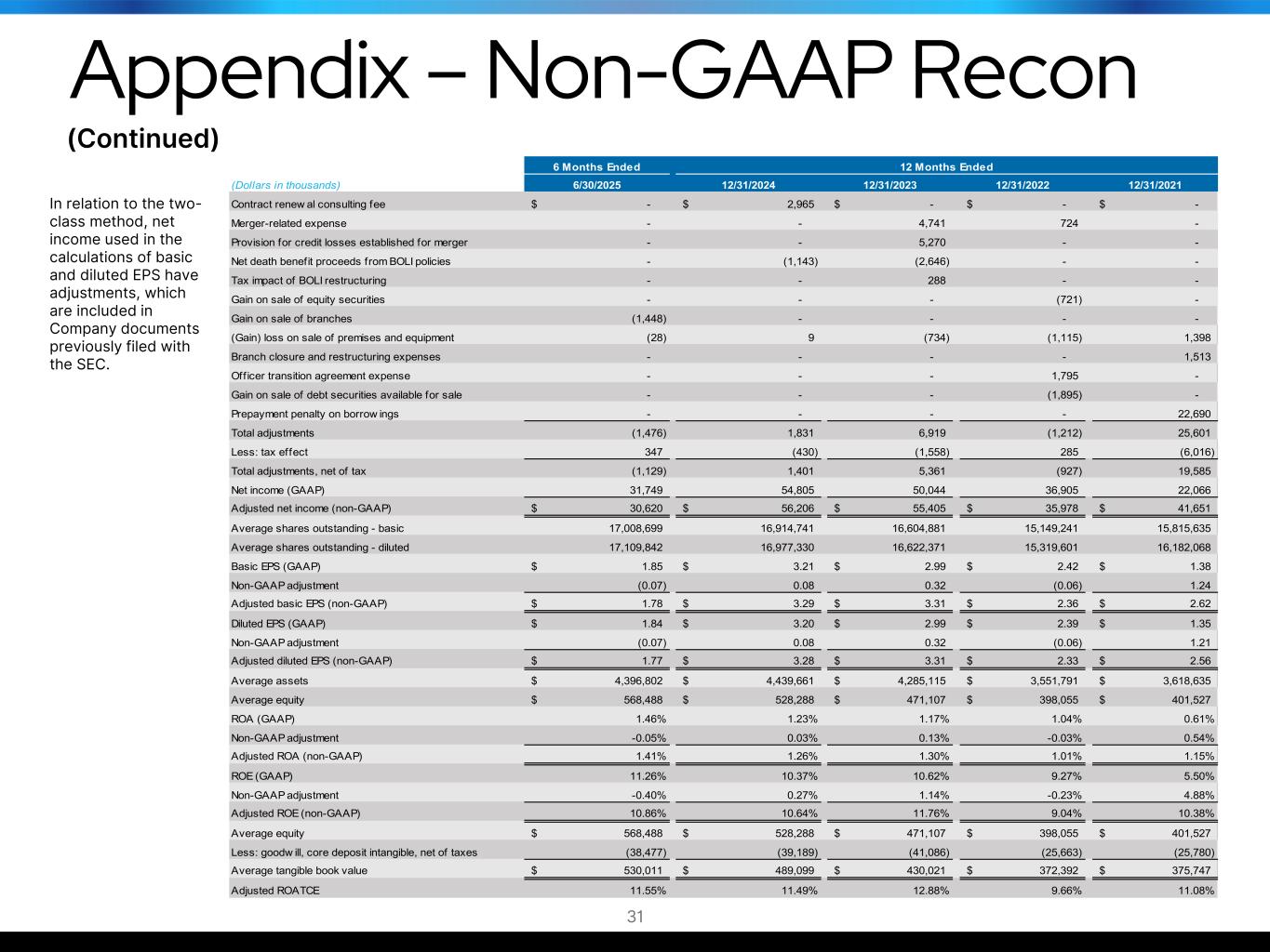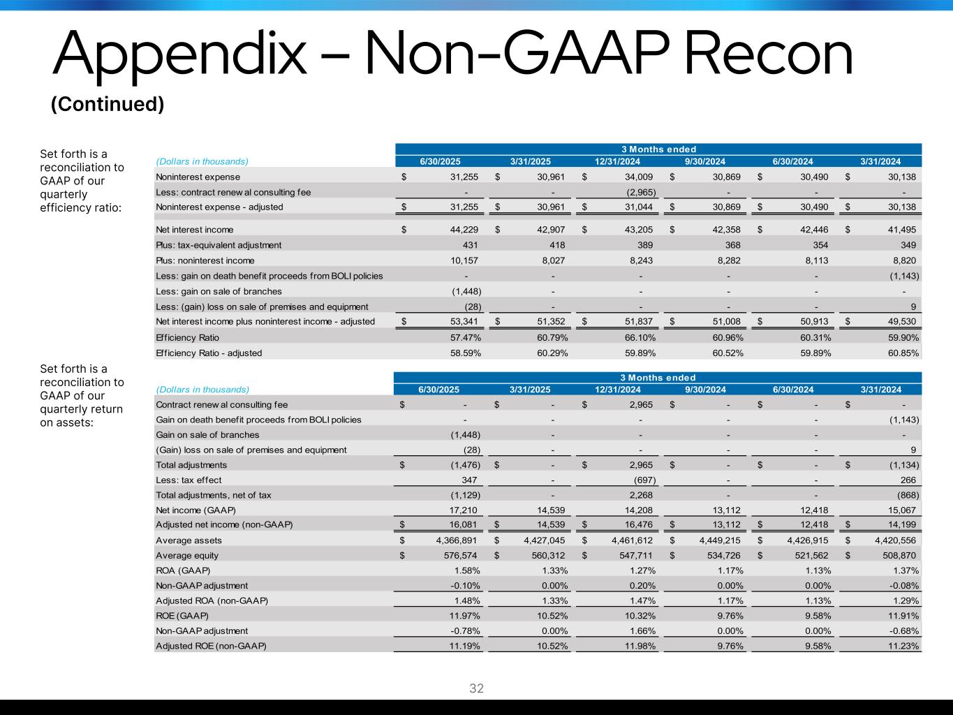 6 Months Ended (Dollars in thousands) 6/30/2025 12/31/2024 12/31/2023 12/31/2022 12/31/2021 Contract renew al consulting fee -$ 2,965$ -$ -$ -$ Merger-related expense - - 4,741 724 - Provision for credit losses established for merger - - 5,270 - - Net death benefit proceeds from BOLI policies - (1,143) (2,646) - - Tax impact of BOLI restructuring - - 288 - - Gain on sale of equity securities - - - (721) - Gain on sale of branches (1,448) - - - - (Gain) loss on sale of premises and equipment (28) 9 (734) (1,115) 1,398 Branch closure and restructuring expenses - - - - 1,513 Off icer transition agreement expense - - - 1,795 - Gain on sale of debt securities available for sale - - - (1,895) - Prepayment penalty on borrow ings - - - - 22,690 Total adjustments (1,476) 1,831 6,919 (1,212) 25,601 Less: tax effect 347 (430) (1,558) 285 (6,016) Total adjustments, net of tax (1,129) 1,401 5,361 (927) 19,585 Net income (GAAP) 31,749 54,805 50,044 36,905 22,066 Adjusted net income (non-GAAP) 30,620$ 56,206$ 55,405$ 35,978$ 41,651$ Average shares outstanding - basic 17,008,699 16,914,741 16,604,881 15,149,241 15,815,635 Average shares outstanding - diluted 17,109,842 16,977,330 16,622,371 15,319,601 16,182,068 Basic EPS (GAAP) 1.85$ 3.21$ 2.99$ 2.42$ 1.38$ Non-GAAP adjustment (0.07) 0.08 0.32 (0.06) 1.24 Adjusted basic EPS (non-GAAP) 1.78$ 3.29$ 3.31$ 2.36$ 2.62$ Diluted EPS (GAAP) 1.84$ 3.20$ 2.99$ 2.39$ 1.35$ Non-GAAP adjustment (0.07) 0.08 0.32 (0.06) 1.21 Adjusted diluted EPS (non-GAAP) 1.77$ 3.28$ 3.31$ 2.33$ 2.56$ Average assets 4,396,802$ 4,439,661$ 4,285,115$ 3,551,791$ 3,618,635$ Average equity 568,488$ 528,288$ 471,107$ 398,055$ 401,527$ ROA (GAAP) 1.46% 1.23% 1.17% 1.04% 0.61% Non-GAAP adjustment -0.05% 0.03% 0.13% -0.03% 0.54% Adjusted ROA (non-GAAP) 1.41% 1.26% 1.30% 1.01% 1.15% ROE (GAAP) 11.26% 10.37% 10.62% 9.27% 5.50% Non-GAAP adjustment -0.40% 0.27% 1.14% -0.23% 4.88% Adjusted ROE (non-GAAP) 10.86% 10.64% 11.76% 9.04% 10.38% Average equity 568,488$ 528,288$ 471,107$ 398,055$ 401,527$ Less: goodw ill, core deposit intangible, net of taxes (38,477) (39,189) (41,086) (25,663) (25,780) Average tangible book value 530,011$ 489,099$ 430,021$ 372,392$ 375,747$ Adjusted ROATCE 11.55% 11.49% 12.88% 9.66% 11.08% 12 Months Ended Appendix – Non-GAAP Recon In relation to the two- class method, net income used in the calculations of basic and diluted EPS have adjustments, which are included in Company documents previously filed with the SEC. (Continued) 31