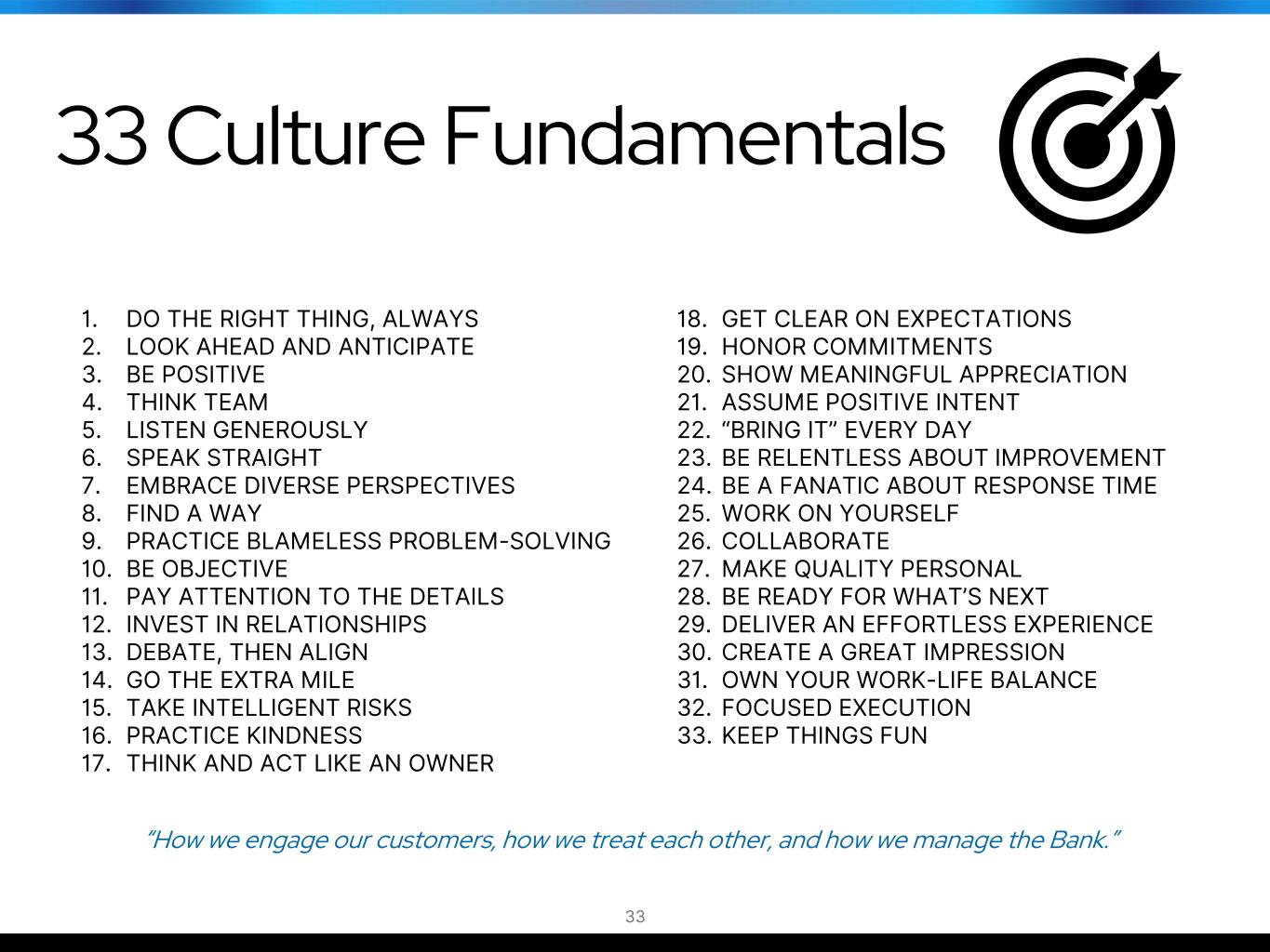 33 Culture Fundamentals 33 1. DO THE RIGHT THING, ALWAYS 2. LOOK AHEAD AND ANTICIPATE 3. BE POSITIVE 4. THINK TEAM 5. LISTEN GENEROUSLY 6. SPEAK STRAIGHT 7. EMBRACE DIVERSE PERSPECTIVES 8. FIND A WAY 9. PRACTICE BLAMELESS PROBLEM-SOLVING 10. BE OBJECTIVE 11. PAY ATTENTION TO THE DETAILS 12. INVEST IN RELATIONSHIPS 13. DEBATE, THEN ALIGN 14. GO THE EXTRA MILE 15. TAKE INTELLIGENT RISKS 16. PRACTICE KINDNESS 17. THINK AND ACT LIKE AN OWNER 18. GET CLEAR ON EXPECTATIONS 19. HONOR COMMITMENTS 20. SHOW MEANINGFUL APPRECIATION 21. ASSUME POSITIVE INTENT 22. “BRING IT” EVERY DAY 23. BE RELENTLESS ABOUT IMPROVEMENT 24. BE A FANATIC ABOUT RESPONSE TIME 25. WORK ON YOURSELF 26. COLLABORATE 27. MAKE QUALITY PERSONAL 28. BE READY FOR WHAT’S NEXT 29. DELIVER AN EFFORTLESS EXPERIENCE 30. CREATE A GREAT IMPRESSION 31. OWN YOUR WORK-LIFE BALANCE 32. FOCUSED EXECUTION 33. KEEP THINGS FUN “How we engage our customers, how we treat each other, and how we manage the Bank.”