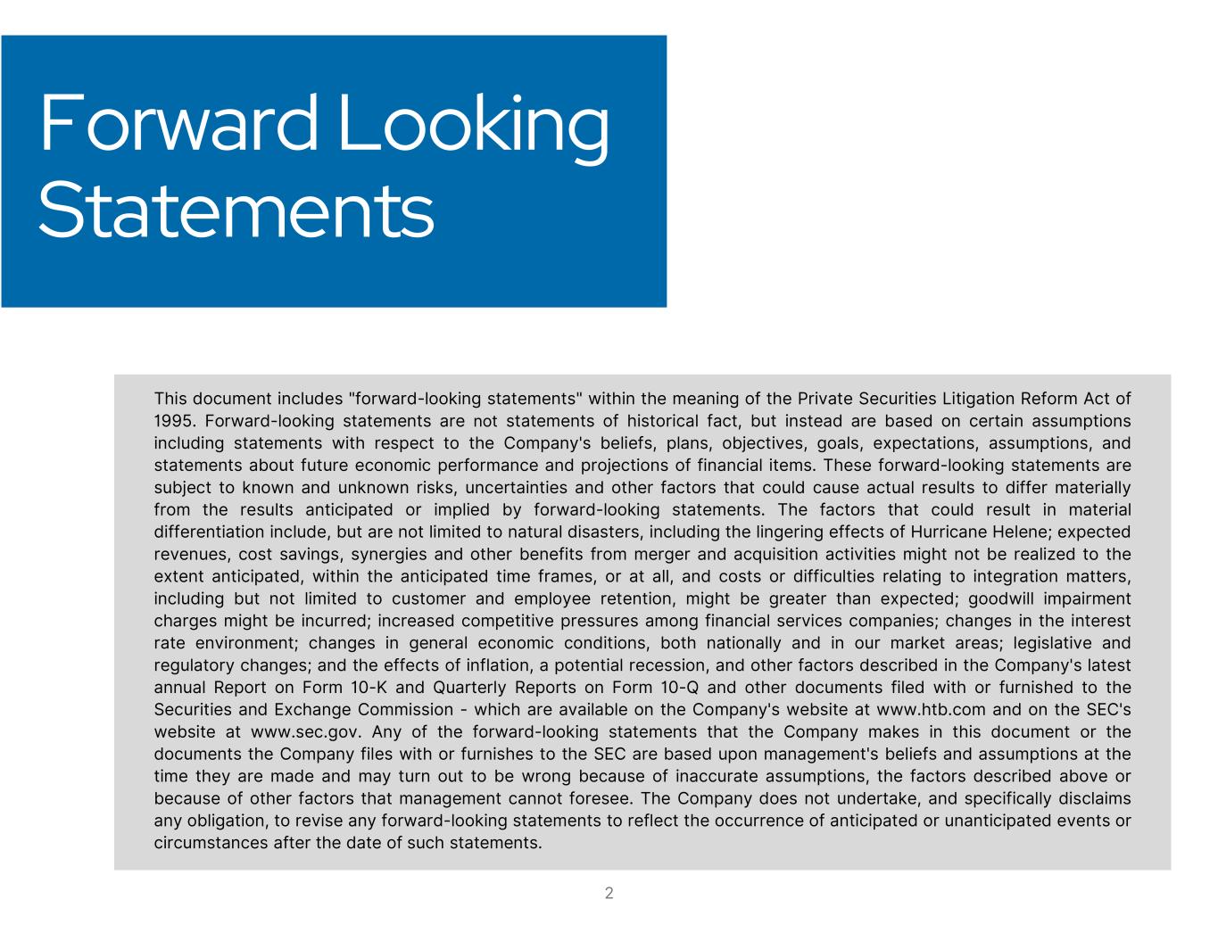 This document includes "forward-looking statements" within the meaning of the Private Securities Litigation Reform Act of 1995. Forward-looking statements are not statements of historical fact, but instead are based on certain assumptions including statements with respect to the Company's beliefs, plans, objectives, goals, expectations, assumptions, and statements about future economic performance and projections of financial items. These forward-looking statements are subject to known and unknown risks, uncertainties and other factors that could cause actual results to differ materially from the results anticipated or implied by forward-looking statements. The factors that could result in material differentiation include, but are not limited to natural disasters, including the lingering effects of Hurricane Helene; expected revenues, cost savings, synergies and other benefits from merger and acquisition activities might not be realized to the extent anticipated, within the anticipated time frames, or at all, and costs or difficulties relating to integration matters, including but not limited to customer and employee retention, might be greater than expected; goodwill impairment charges might be incurred; increased competitive pressures among financial services companies; changes in the interest rate environment; changes in general economic conditions, both nationally and in our market areas; legislative and regulatory changes; and the effects of inflation, a potential recession, and other factors described in the Company's latest annual Report on Form 10-K and Quarterly Reports on Form 10-Q and other documents filed with or furnished to the Securities and Exchange Commission - which are available on the Company's website at www.htb.com and on the SEC's website at www.sec.gov. Any of the forward-looking statements that the Company makes in this document or the documents the Company files with or furnishes to the SEC are based upon management's beliefs and assumptions at the time they are made and may turn out to be wrong because of inaccurate assumptions, the factors described above or because of other factors that management cannot foresee. The Company does not undertake, and specifically disclaims any obligation, to revise any forward-looking statements to reflect the occurrence of anticipated or unanticipated events or circumstances after the date of such statements. Forward Looking Statements 2