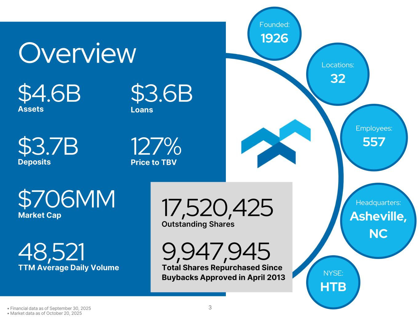 Founded: 1926 Locations: 32 Employees: 557 Headquarters: Asheville, NC NYSE: HTB Overview $4.6B Assets $3.6B Loans $3.7B Deposits 127% Price to TBV 9,947,945 Total Shares Repurchased Since Buybacks Approved in April 2013 $706MM Market Cap 48,521 TTM Average Daily Volume 17,520,425 Outstanding Shares • Financial data as of September 30, 2025 • Market data as of October 20, 2025 3