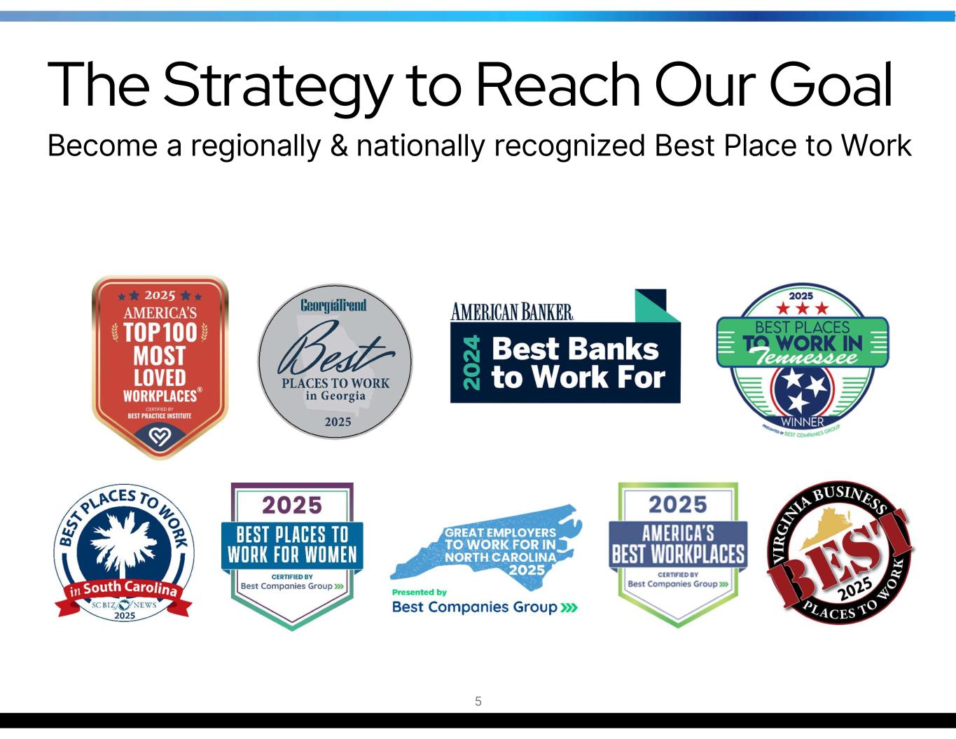 One of the Top 50 Community Banks two years in a row - 2023 and 2024 One of the Top 100 Best Banks two years in a row - 2024 and 2025 One of the Top 100 Best U.S. Banks less than $5 billion two years in a row – 2024 and 2025 4 Our Goal Become a High-Performing, Regional Community Bank One of only 16 banks (top 5%) recognized for consistent earnings growth over the past 10 years 2025
