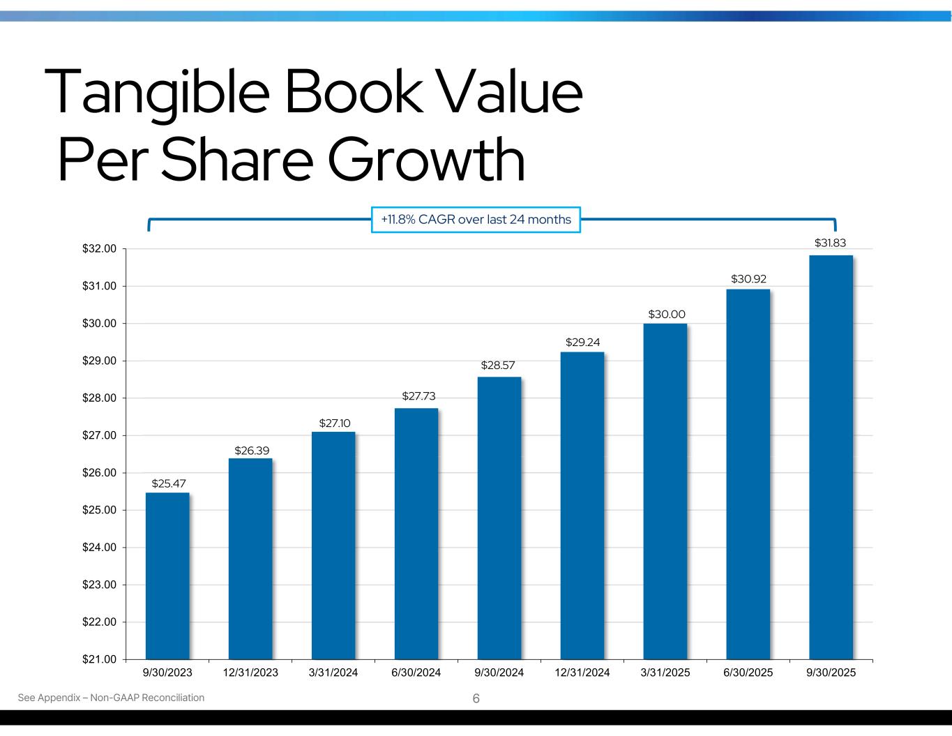 $25.47 $26.39 $27.10 $27.73 $28.57 $29.24 $30.00 $30.92 $31.83 $21.00 $22.00 $23.00 $24.00 $25.00 $26.00 $27.00 $28.00 $29.00 $30.00 $31.00 $32.00 9/30/2023 12/31/2023 3/31/2024 6/30/2024 9/30/2024 12/31/2024 3/31/2025 6/30/2025 9/30/2025 See Appendix – Non-GAAP Reconciliation Tangible Book Value Per Share Growth +11.8% CAGR over last 24 months 6
