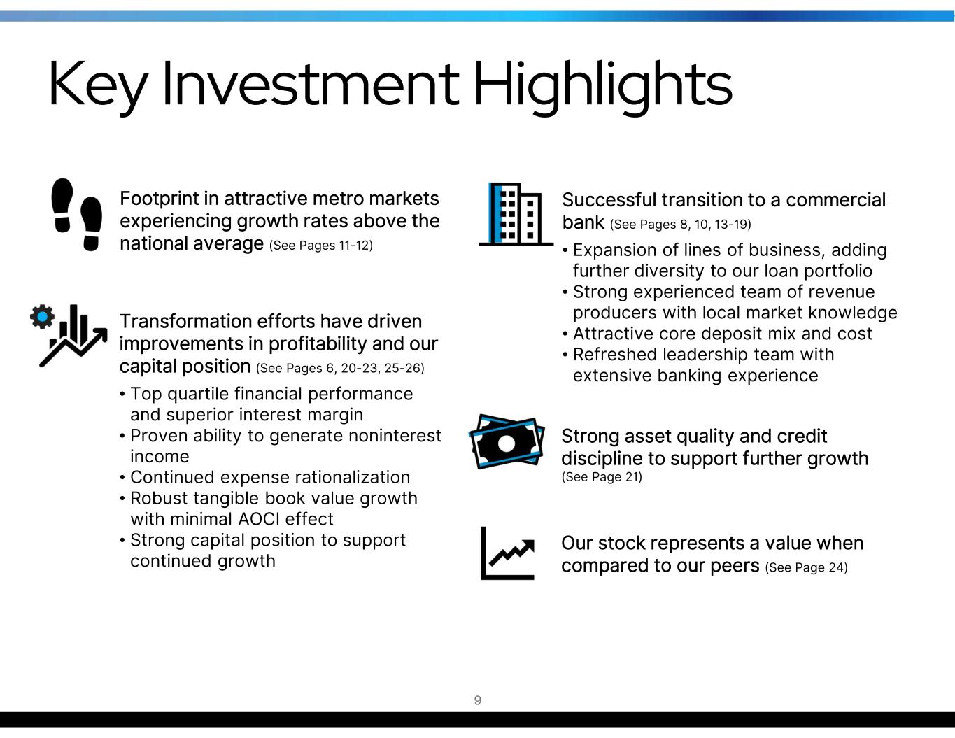 Focused Deposit Growth Organizational Maturity Strategic Framework High Performance Best Place to Work Added Shareholder Value Engaged Employees Collaborative Culture Great Markets for Business Strong Balance Sheet Foundation Priorities Goals 8