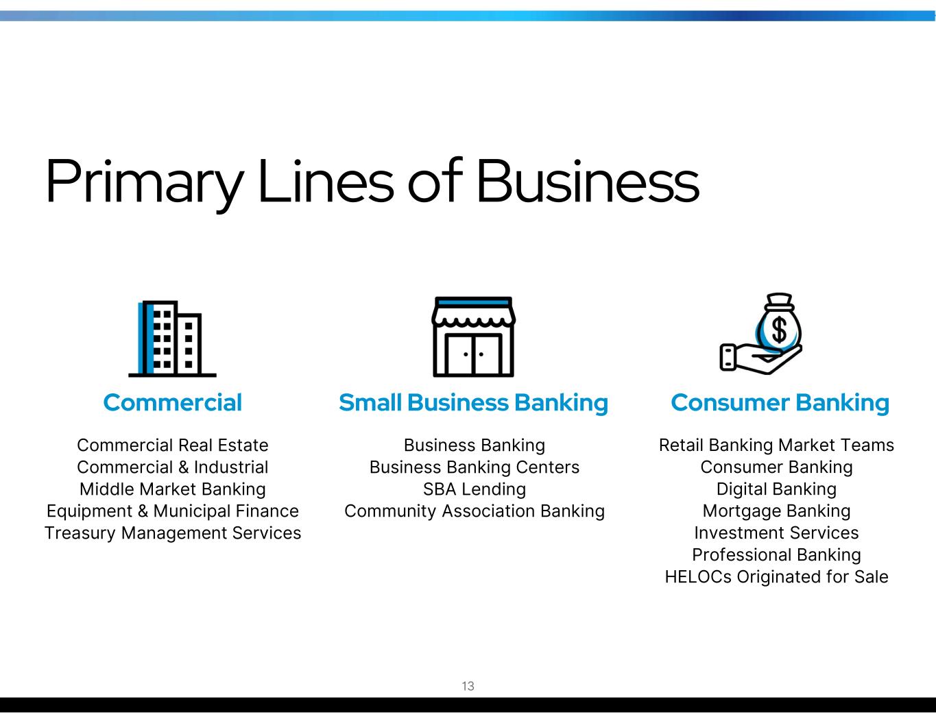 Business Banking Business Banking Centers SBA Lending Community Association Banking Small Business Banking Consumer Banking Commercial Commercial Real Estate Commercial & Industrial Middle Market Banking Equipment & Municipal Finance Treasury Management Services Retail Banking Market Teams Consumer Banking Digital Banking Mortgage Banking Investment Services Professional Banking HELOCs Originated for Sale Primary Lines of Business 13