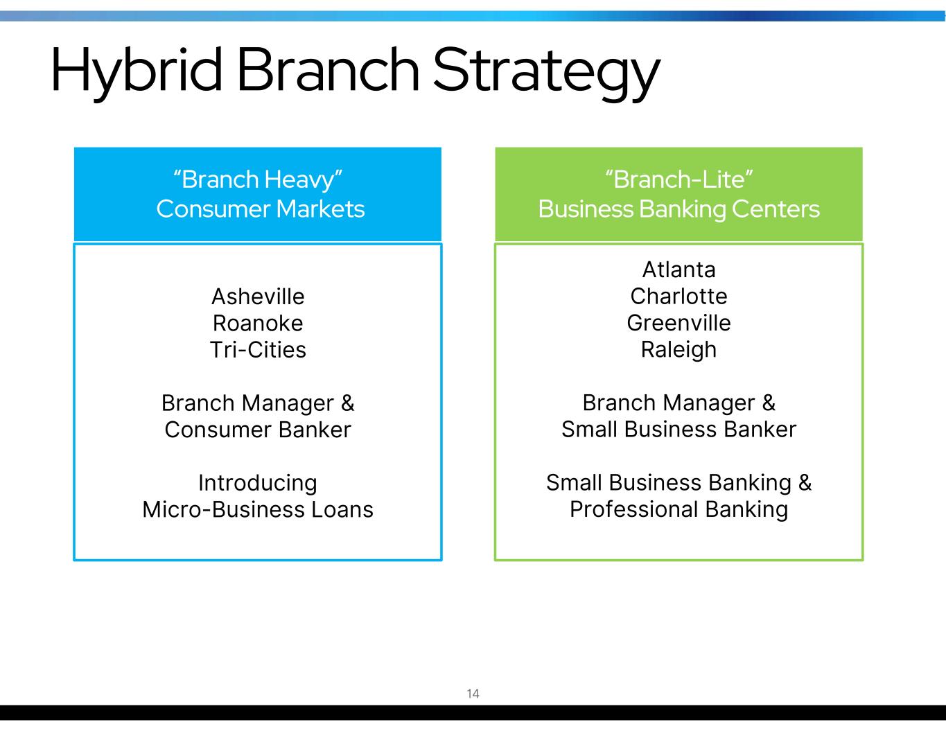 “Branch-Lite” Business Banking Centers “Branch Heavy” Consumer Markets Asheville Roanoke Tri-Cities Branch Manager & Consumer Banker Introducing Micro-Business Loans Atlanta Charlotte Greenville Raleigh Branch Manager & Small Business Banker Small Business Banking & Professional Banking 14 Hybrid Branch Strategy