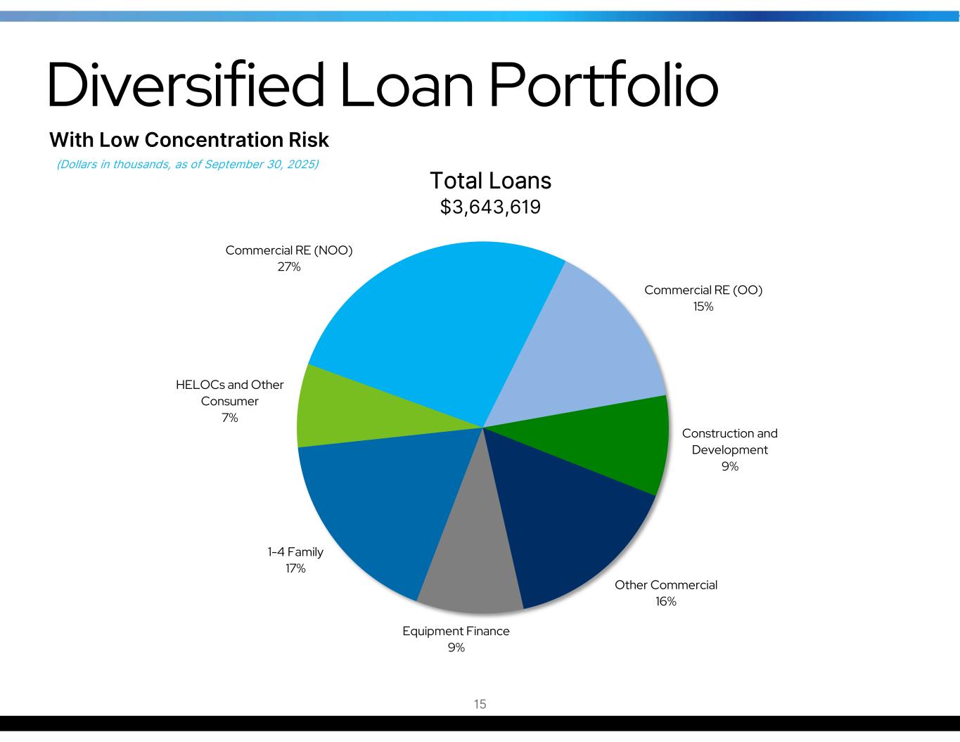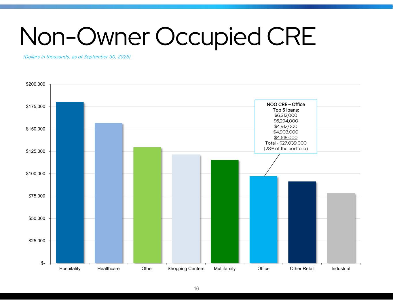 Commercial RE (NOO) 27% Commercial RE (OO) 15% Construction and Development 9% Other Commercial 16% Equipment Finance 9% 1-4 Family 17% HELOCs and Other Consumer 7% Diversified Loan Portfolio 15 Total Loans $3,643,619 (Dollars in thousands, as of September 30, 2025) With Low Concentration Risk