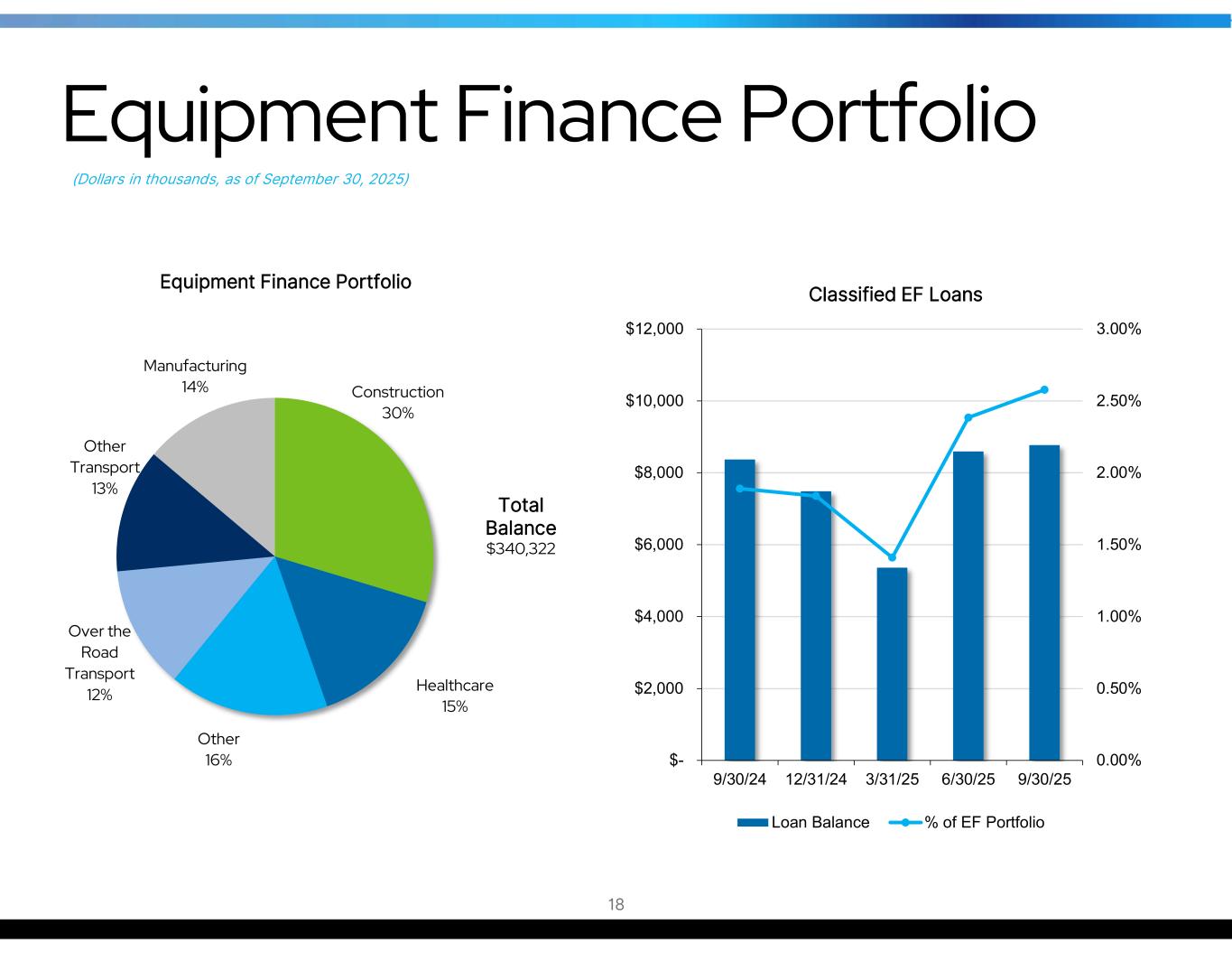C&I 34% Hotel 29% Retail 24% Other 9% Office 4% SBA Portfolio Total Balance $135,157 Guaranteed Balance $44,323 0.00% 2.00% 4.00% 6.00% 8.00% 10.00% 12.00% $- $1,500 $3,000 $4,500 $6,000 $7,500 $9,000 9/30/24 12/31/24 3/31/25 6/30/25 9/30/25 Classified SBA Loans Unguaranteed Balance % of SBA Portfolio 17 SBA Loans Portfolio (Dollars in thousands, as of September 30, 2025)