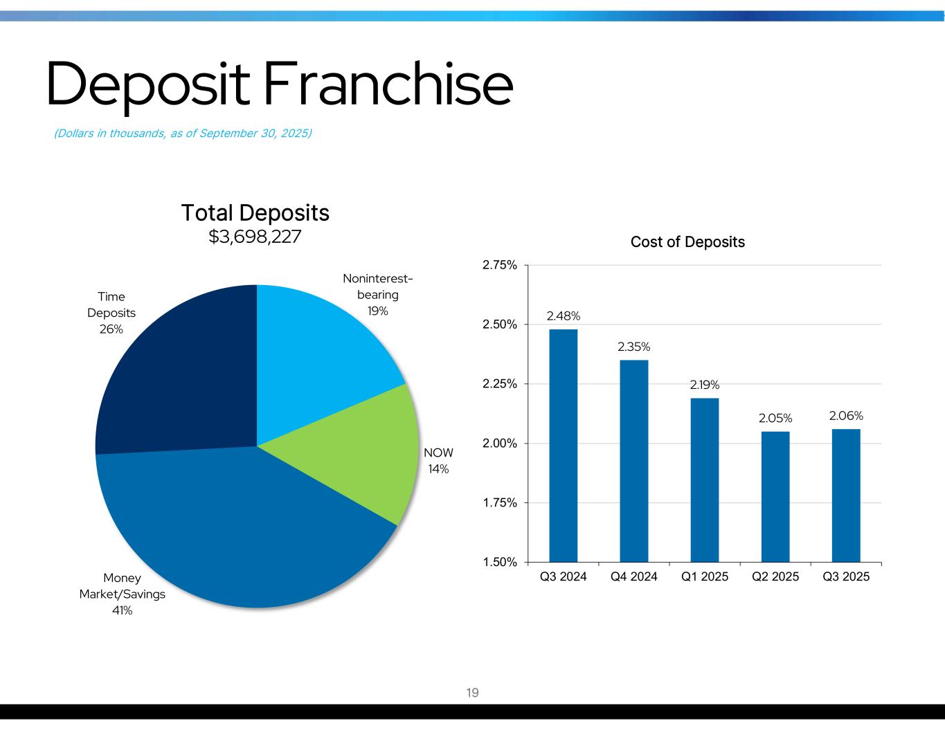 0.00% 0.50% 1.00% 1.50% 2.00% 2.50% 3.00% $- $2,000 $4,000 $6,000 $8,000 $10,000 $12,000 9/30/24 12/31/24 3/31/25 6/30/25 9/30/25 Classified EF Loans Loan Balance % of EF Portfolio 18 Equipment Finance Portfolio (Dollars in thousands, as of September 30, 2025) Construction 30% Healthcare 15% Other 16% Over the Road Transport 12% Other Transport 13% Manufacturing 14% Equipment Finance Portfolio Total Balance $340,322
