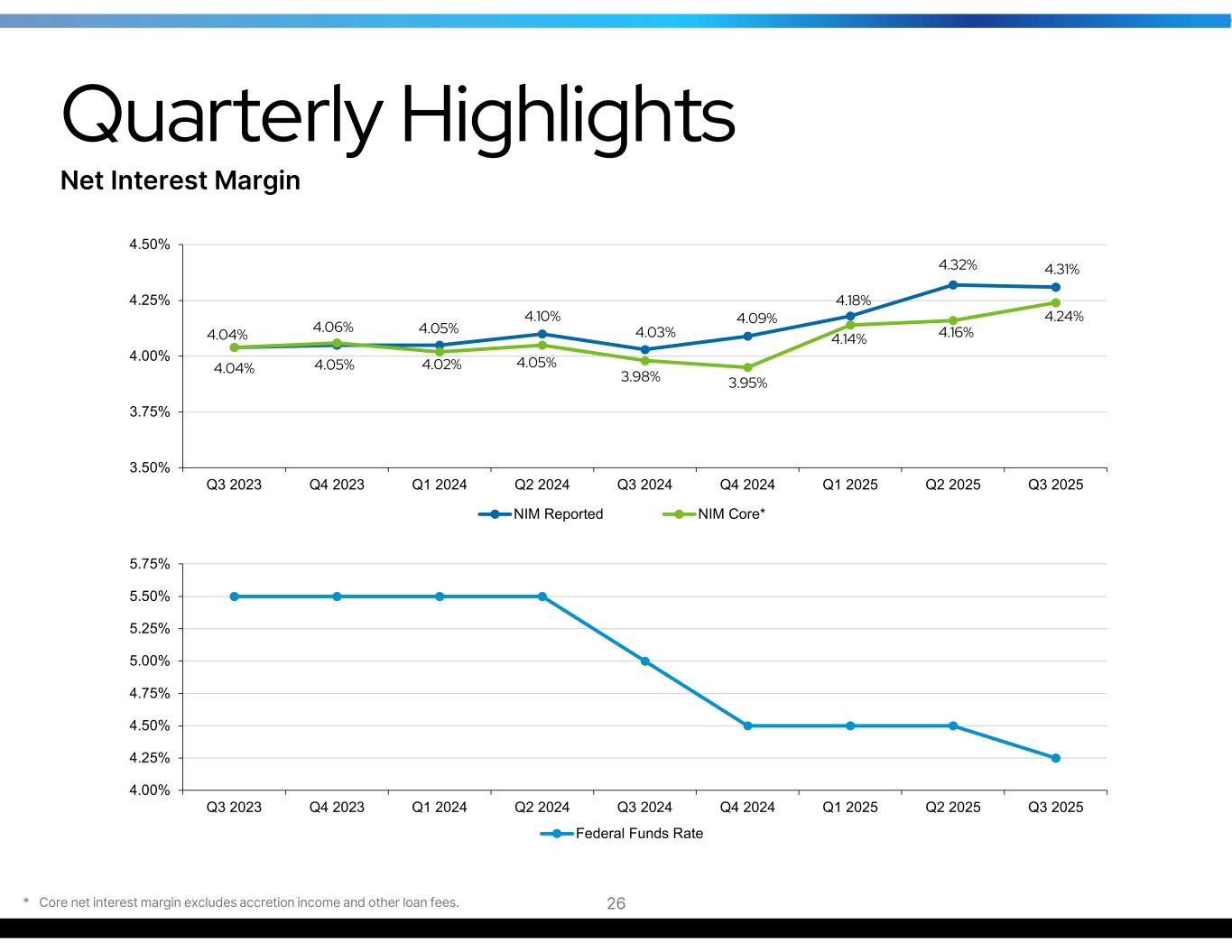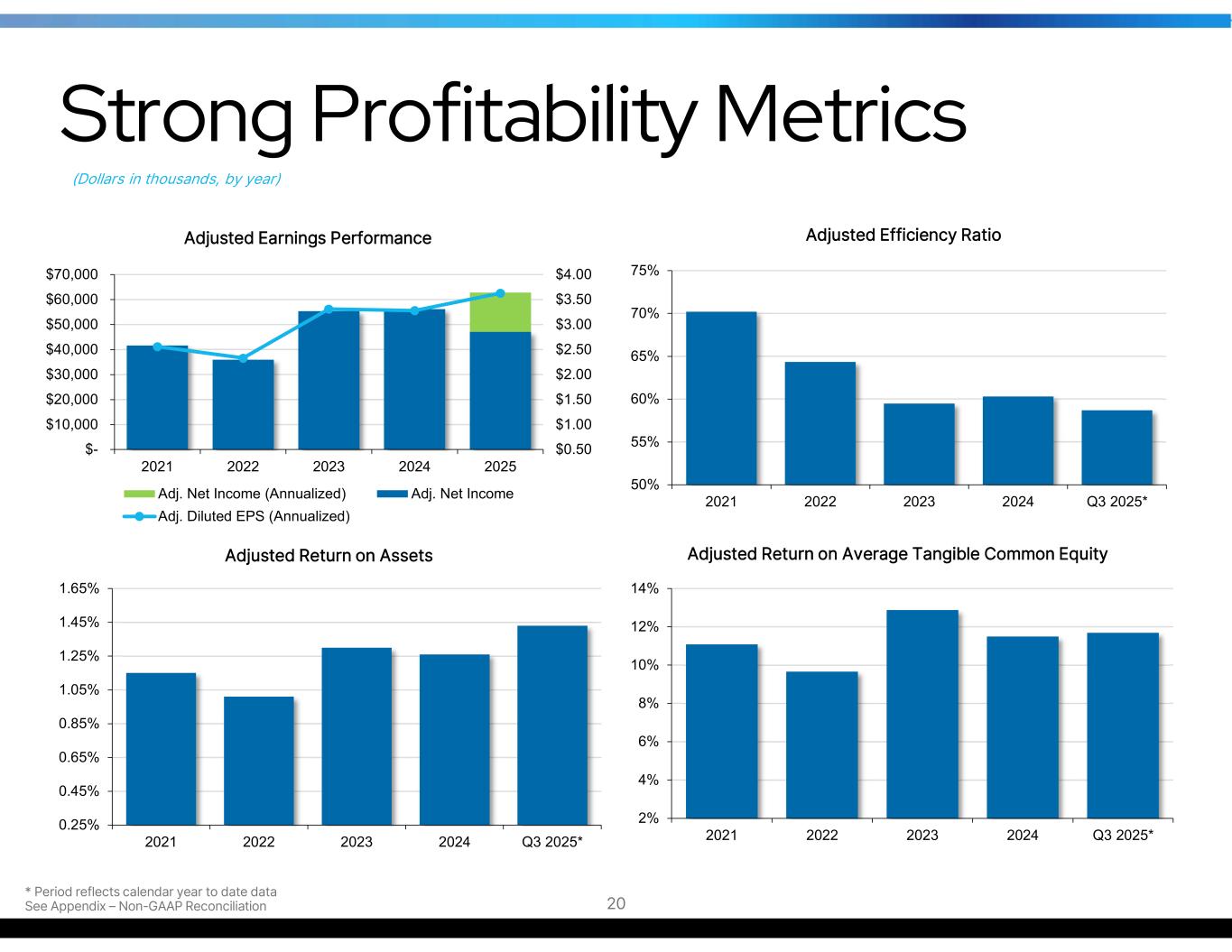 Quarterly Highlights 6/30/20249/30/202412/31/20243/31/20256/30/20259/30/2025Net Income Per Share $ 0.73$ 0.77$ 0.83$ 0.84$ 1.01$ 0.96Basic $ 0.73$ 0.76$ 0.83$ 0.84$ 1.00$ 0.95Diluted See Appendix – Non-GAAP Reconciliation 6/30/20249/30/202412/31/20243/31/20256/30/20259/30/2025Performance Ratios 1.13 %1.17 %1.27 %1.33 %1.58 %1.48 %Return on assets (ROA) 9.58 %9.76 %10.32 %10.52 %11.97 %11.10 %Return on equity (ROE) 6.32 %6.34 %6.27 %6.20 %6.22 %6.21 %Yield on earning assets 3.01 %3.09 %2.94 %2.73 %2.61 %2.63 %Rate paid on interest-bearing liabilities 4.10 %4.03 %4.09 %4.18 %4.32 %4.31%Net interest margin 59.89 %60.52 %59.89 %60.29 %58.59 %57.28%Efficiency ratio - adjusted 6/30/20249/30/202412/31/20243/31/20256/30/20259/30/2025Asset Quality Ratios 0.54 %0.64 %0.63 %0.61 %0.67 %0.72 %Nonperforming assets to total assets 0.68 %0.78 %0.76 %0.74 %0.81 %0.89%Nonperforming loans to total loans 0.91 %0.99 %1.06 %0.85 %1.07 %1.23%Classified assets to total assets 194.80 %166.51 %163.68 %165.96 %147.98 %132.26 %ACL to nonperforming loans 1.33 %1.30 %1.24 %1.23 %1.20 %1.18 %ACL to total loans 0.27 %0.42 %0.19 %0.14 %0.21 %0.29 %Net charge-offs to average loans 25