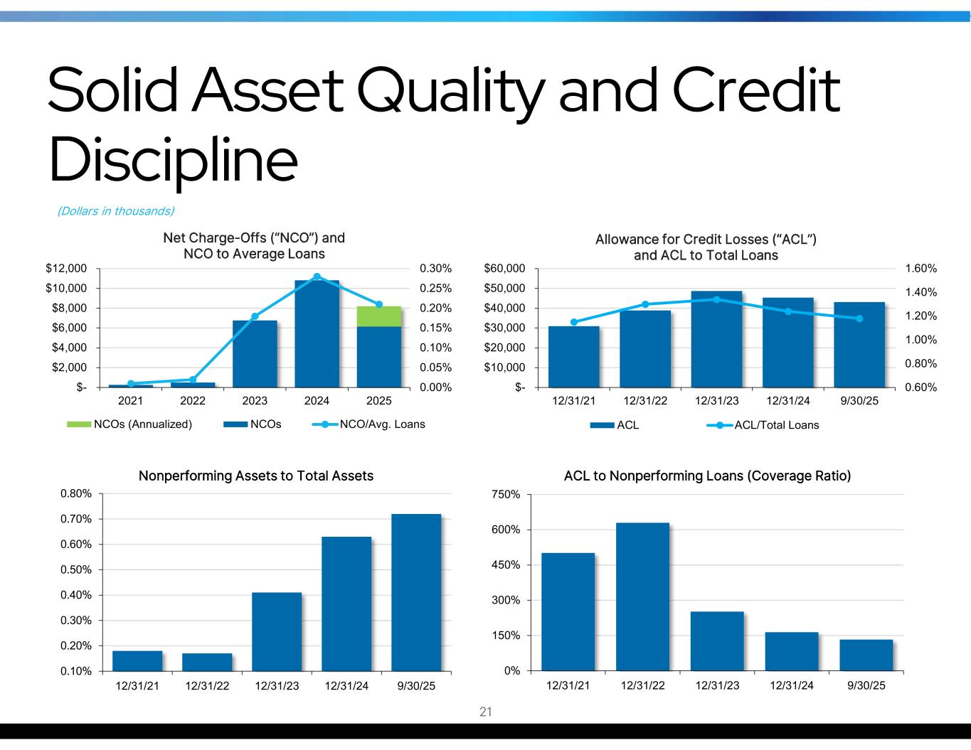 Strong Profitability Metrics (Dollars in thousands, by year) $0.50 $1.00 $1.50 $2.00 $2.50 $3.00 $3.50 $4.00 $- $10,000 $20,000 $30,000 $40,000 $50,000 $60,000 $70,000 2021 2022 2023 2024 2025 Adjusted Earnings Performance Adj. Net Income (Annualized) Adj. Net Income Adj. Diluted EPS (Annualized) 0.25% 0.45% 0.65% 0.85% 1.05% 1.25% 1.45% 1.65% 2021 2022 2023 2024 Q3 2025* Adjusted Return on Assets 50% 55% 60% 65% 70% 75% 2021 2022 2023 2024 Q3 2025* Adjusted Efficiency Ratio 2% 4% 6% 8% 10% 12% 14% 2021 2022 2023 2024 Q3 2025* Adjusted Return on Average Tangible Common Equity * Period reflects calendar year to date data See Appendix – Non-GAAP Reconciliation 20