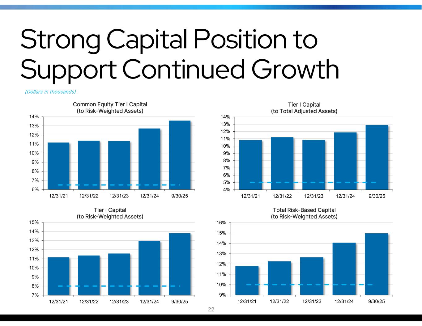 Strong Capital Position to Support Continued Growth (Dollars in thousands) 7% 8% 9% 10% 11% 12% 13% 14% 15% 12/31/21 12/31/22 12/31/23 12/31/24 9/30/25 Tier I Capital (to Risk-Weighted Assets) 9% 10% 11% 12% 13% 14% 15% 16% 12/31/21 12/31/22 12/31/23 12/31/24 9/30/25 Total Risk-Based Capital (to Risk-Weighted Assets) 6% 7% 8% 9% 10% 11% 12% 13% 14% 12/31/21 12/31/22 12/31/23 12/31/24 9/30/25 Common Equity Tier I Capital (to Risk-Weighted Assets) 4% 5% 6% 7% 8% 9% 10% 11% 12% 13% 14% 12/31/21 12/31/22 12/31/23 12/31/24 9/30/25 Tier I Capital (to Total Adjusted Assets) 22
