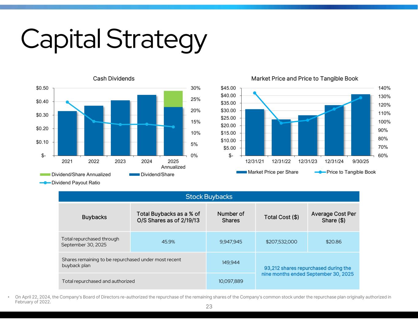 Capital Strategy 0% 5% 10% 15% 20% 25% 30% $- $0.10 $0.20 $0.30 $0.40 $0.50 2021 2022 2023 2024 2025 Annualized Cash Dividends Dividend/Share Annualized Dividend/Share Dividend Payout Ratio 60% 70% 80% 90% 100% 110% 120% 130% 140% $- $5.00 $10.00 $15.00 $20.00 $25.00 $30.00 $35.00 $40.00 $45.00 12/31/21 12/31/22 12/31/23 12/31/24 9/30/25 Market Price and Price to Tangible Book Market Price per Share Price to Tangible Book Stock Buybacks Average Cost Per Share ($)Total Cost ($) Number of Shares Total Buybacks as a % of O/S Shares as of 2/19/13Buybacks $20.86$207,532,0009,947,94545.9%Total repurchased through September 30, 2025 93,212 shares repurchased during the nine months ended September 30, 2025 149,944Shares remaining to be repurchased under most recent buyback plan 10,097,889Total repurchased and authorized • On April 22, 2024, the Company's Board of Directors re-authorized the repurchase of the remaining shares of the Company’s common stock under the repurchase plan originally authorized in February of 2022. 23