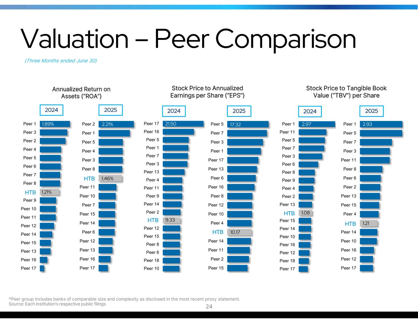 (Three Months ended June 30) Valuation – Peer Comparison *Peer group includes banks of comparable size and complexity as disclosed in the most recent proxy statement. Source: Each institution’s respective public filings 24 1.21% 1.89% Peer 17 Peer 16 Peer 13 Peer 15 Peer 14 Peer 12 Peer 11 Peer 10 Peer 9 Peer 8 Peer 7 Peer 6 Peer 5 Peer 4 Peer 2 Peer 3 Peer 1 2024 1.46% 2.21% Peer 17 Peer 16 Peer 13 Peer 12 Peer 6 Peer 14 Peer 15 Peer 7 Peer 10 Peer 11 Peer 8 Peer 3 Peer 4 Peer 5 Peer 1 Peer 2 2025 10.17 17.32 Peer 15 Peer 2 Peer 11 Peer 14 Peer 4 Peer 10 Peer 12 Peer 8 Peer 16 Peer 6 Peer 13 Peer 17 Peer 1 Peer 3 Peer 7 Peer 5 2025 9.33 21.50 Peer 10 Peer 18 Peer 6 Peer 8 Peer 15 Peer 12 Peer 2 Peer 14 Peer 9 Peer 11 Peer 4 Peer 13 Peer 3 Peer 7 Peer 1 Peer 5 Peer 16 Peer 17 2024 1.08 2.97 Peer 17 Peer 18 Peer 12 Peer 16 Peer 10 Peer 14 Peer 15 Peer 13 Peer 2 Peer 4 Peer 9 Peer 8 Peer 6 Peer 3 Peer 7 Peer 5 Peer 11 Peer 1 2024 1.21 2.93 Peer 17 Peer 12 Peer 16 Peer 10 Peer 14 Peer 4 Peer 15 Peer 13 Peer 2 Peer 6 Peer 8 Peer 11 Peer 3 Peer 7 Peer 5 Peer 1 2025 Annualized Return on Assets (“ROA”) Stock Price to Annualized Earnings per Share (“EPS”) Stock Price to Tangible Book Value (“TBV”) per Share HTB HTB HTB HTB HTB HTB