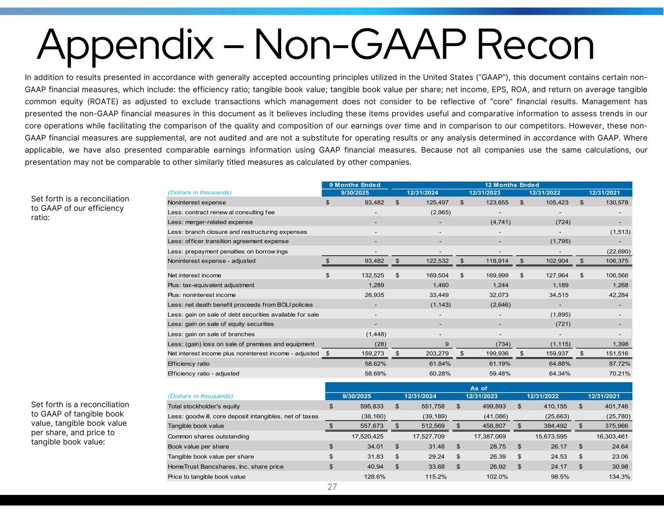 Appendix – Non-GAAP Recon In addition to results presented in accordance with generally accepted accounting principles utilized in the United States (“GAAP”), this document contains certain non- GAAP financial measures, which include: the efficiency ratio; tangible book value; tangible book value per share; net income, EPS, ROA, and return on average tangible common equity (ROATE) as adjusted to exclude transactions which management does not consider to be reflective of “core” financial results. Management has presented the non-GAAP financial measures in this document as it believes including these items provides useful and comparative information to assess trends in our core operations while facilitating the comparison of the quality and composition of our earnings over time and in comparison to our competitors. However, these non- GAAP financial measures are supplemental, are not audited and are not a substitute for operating results or any analysis determined in accordance with GAAP. Where applicable, we have also presented comparable earnings information using GAAP financial measures. Because not all companies use the same calculations, our presentation may not be comparable to other similarly titled measures as calculated by other companies. 9 Months Ended (Dollars in thousands) 9/30/2025 12/31/2024 12/31/2023 12/31/2022 12/31/2021 Noninterest expense 93,482$ 125,497$ 123,655$ 105,423$ 130,578$ Less: contract renew al consulting fee - (2,965) - - - Less: merger-related expense - - (4,741) (724) - Less: branch closure and restructuring expenses - - - - (1,513) Less: of f icer transition agreement expense - - - (1,795) - Less: prepayment penalties on borrow ings - - - - (22,690) Noninterest expense - adjusted 93,482$ 122,532$ 118,914$ 102,904$ 106,375$ Net interest income 132,525$ 169,504$ 169,999$ 127,964$ 106,566$ Plus: tax-equivalent adjustment 1,289 1,460 1,244 1,189 1,268 Plus: noninterest income 26,935 33,449 32,073 34,515 42,284 Less: net death benefit proceeds from BOLI policies - (1,143) (2,646) - - Less: gain on sale of debt securities available for sale - - - (1,895) - Less: gain on sale of equity securities - - - (721) - Less: gain on sale of branches (1,448) - - - - Less: (gain) loss on sale of premises and equipment (28) 9 (734) (1,115) 1,398 Net interest income plus noninterest income - adjusted 159,273$ 203,279$ 199,936$ 159,937$ 151,516$ Eff iciency ratio 58.62% 61.84% 61.19% 64.88% 87.72% Efficiency ratio - adjusted 58.69% 60.28% 59.48% 64.34% 70.21% 12 Months Ended (Dollars in thousands) 9/30/2025 12/31/2024 12/31/2023 12/31/2022 12/31/2021 Total stockholder's equity 595,833$ 551,758$ 499,893$ 410,155$ 401,746$ Less: goodw ill, core deposit intangibles, net of taxes (38,160) (39,189) (41,086) (25,663) (25,780) Tangible book value 557,673$ 512,569$ 458,807$ 384,492$ 375,966$ Common shares outstanding 17,520,425 17,527,709 17,387,069 15,673,595 16,303,461 Book value per share 34.01$ 31.48$ 28.75$ 26.17$ 24.64$ Tangible book value per share 31.83$ 29.24$ 26.39$ 24.53$ 23.06$ HomeTrust Bancshares, Inc. share price 40.94$ 33.68$ 26.92$ 24.17$ 30.98$ Price to tangible book value 128.6% 115.2% 102.0% 98.5% 134.3% As of Set forth is a reconciliation to GAAP of our efficiency ratio: Set forth is a reconciliation to GAAP of tangible book value, tangible book value per share, and price to tangible book value: 27