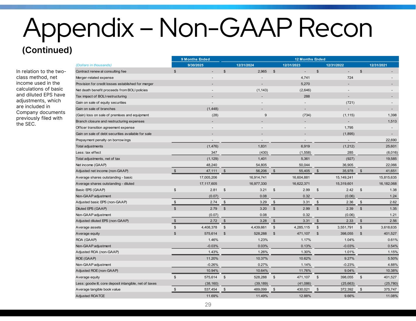 9 Months Ended (Dollars in thousands) 9/30/2025 12/31/2024 12/31/2023 12/31/2022 12/31/2021 Contract renew al consulting fee -$ 2,965$ -$ -$ -$ Merger-related expense - - 4,741 724 - Provision for credit losses established for merger - - 5,270 - - Net death benefit proceeds from BOLI policies - (1,143) (2,646) - - Tax impact of BOLI restructuring - - 288 - - Gain on sale of equity securities - - - (721) - Gain on sale of branches (1,448) - - - - (Gain) loss on sale of premises and equipment (28) 9 (734) (1,115) 1,398 Branch closure and restructuring expenses - - - - 1,513 Officer transition agreement expense - - - 1,795 - Gain on sale of debt securities available for sale - - - (1,895) - Prepayment penalty on borrow ings - - - - 22,690 Total adjustments (1,476) 1,831 6,919 (1,212) 25,601 Less: tax effect 347 (430) (1,558) 285 (6,016) Total adjustments, net of tax (1,129) 1,401 5,361 (927) 19,585 Net income (GAAP) 48,240 54,805 50,044 36,905 22,066 Adjusted net income (non-GAAP) 47,111$ 56,206$ 55,405$ 35,978$ 41,651$ Average shares outstanding - basic 17,005,206 16,914,741 16,604,881 15,149,241 15,815,635 Average shares outstanding - diluted 17,117,605 16,977,330 16,622,371 15,319,601 16,182,068 Basic EPS (GAAP) 2.81$ 3.21$ 2.99$ 2.42$ 1.38$ Non-GAAP adjustment (0.07) 0.08 0.32 (0.06) 1.24 Adjusted basic EPS (non-GAAP) 2.74$ 3.29$ 3.31$ 2.36$ 2.62$ Diluted EPS (GAAP) 2.79$ 3.20$ 2.99$ 2.39$ 1.35$ Non-GAAP adjustment (0.07) 0.08 0.32 (0.06) 1.21 Adjusted diluted EPS (non-GAAP) 2.72$ 3.28$ 3.31$ 2.33$ 2.56$ Average assets 4,408,378$ 4,439,661$ 4,285,115$ 3,551,791$ 3,618,635$ Average equity 575,614$ 528,288$ 471,107$ 398,055$ 401,527$ ROA (GAAP) 1.46% 1.23% 1.17% 1.04% 0.61% Non-GAAP adjustment -0.03% 0.03% 0.13% -0.03% 0.54% Adjusted ROA (non-GAAP) 1.43% 1.26% 1.30% 1.01% 1.15% ROE (GAAP) 11.20% 10.37% 10.62% 9.27% 5.50% Non-GAAP adjustment -0.26% 0.27% 1.14% -0.23% 4.88% Adjusted ROE (non-GAAP) 10.94% 10.64% 11.76% 9.04% 10.38% Average equity 575,614$ 528,288$ 471,107$ 398,055$ 401,527$ Less: goodw ill, core deposit intangible, net of taxes (38,160) (39,189) (41,086) (25,663) (25,780) Average tangible book value 537,454$ 489,099$ 430,021$ 372,392$ 375,747$ Adjusted ROATCE 11.69% 11.49% 12.88% 9.66% 11.08% 12 Months Ended Appendix – Non-GAAP Recon In relation to the two- class method, net income used in the calculations of basic and diluted EPS have adjustments, which are included in Company documents previously filed with the SEC. (Continued) 29