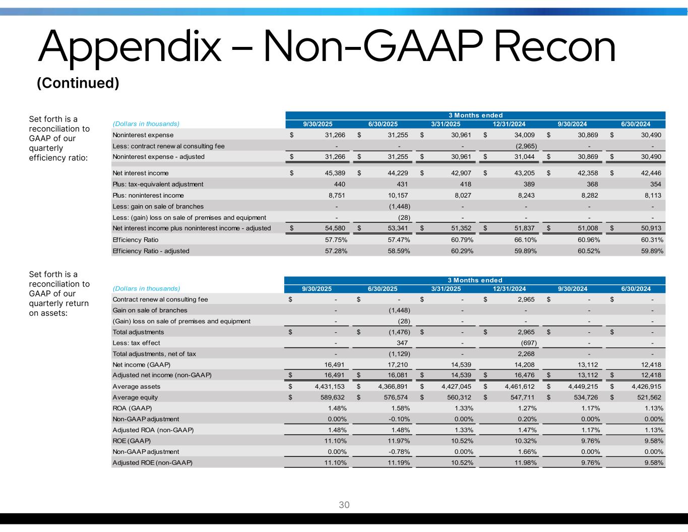 (Dollars in thousands) 9/30/2025 6/30/2025 3/31/2025 12/31/2024 9/30/2024 6/30/2024 Noninterest expense 31,266$ 31,255$ 30,961$ 34,009$ 30,869$ 30,490$ Less: contract renew al consulting fee - - - (2,965) - - Noninterest expense - adjusted 31,266$ 31,255$ 30,961$ 31,044$ 30,869$ 30,490$ Net interest income 45,389$ 44,229$ 42,907$ 43,205$ 42,358$ 42,446$ Plus: tax-equivalent adjustment 440 431 418 389 368 354 Plus: noninterest income 8,751 10,157 8,027 8,243 8,282 8,113 Less: gain on sale of branches - (1,448) - - - - Less: (gain) loss on sale of premises and equipment - (28) - - - - Net interest income plus noninterest income - adjusted 54,580$ 53,341$ 51,352$ 51,837$ 51,008$ 50,913$ Eff iciency Ratio 57.75% 57.47% 60.79% 66.10% 60.96% 60.31% Efficiency Ratio - adjusted 57.28% 58.59% 60.29% 59.89% 60.52% 59.89% 3 Months ended Appendix – Non-GAAP Recon Set forth is a reconciliation to GAAP of our quarterly return on assets: (Dollars in thousands) 9/30/2025 6/30/2025 3/31/2025 12/31/2024 9/30/2024 6/30/2024 Contract renew al consulting fee -$ -$ -$ 2,965$ -$ -$ Gain on sale of branches - (1,448) - - - - (Gain) loss on sale of premises and equipment - (28) - - - - Total adjustments -$ (1,476)$ -$ 2,965$ -$ -$ Less: tax effect - 347 - (697) - - Total adjustments, net of tax - (1,129) - 2,268 - - Net income (GAAP) 16,491 17,210 14,539 14,208 13,112 12,418 Adjusted net income (non-GAAP) 16,491$ 16,081$ 14,539$ 16,476$ 13,112$ 12,418$ Average assets 4,431,153$ 4,366,891$ 4,427,045$ 4,461,612$ 4,449,215$ 4,426,915$ Average equity 589,632$ 576,574$ 560,312$ 547,711$ 534,726$ 521,562$ ROA (GAAP) 1.48% 1.58% 1.33% 1.27% 1.17% 1.13% Non-GAAP adjustment 0.00% -0.10% 0.00% 0.20% 0.00% 0.00% Adjusted ROA (non-GAAP) 1.48% 1.48% 1.33% 1.47% 1.17% 1.13% ROE (GAAP) 11.10% 11.97% 10.52% 10.32% 9.76% 9.58% Non-GAAP adjustment 0.00% -0.78% 0.00% 1.66% 0.00% 0.00% Adjusted ROE (non-GAAP) 11.10% 11.19% 10.52% 11.98% 9.76% 9.58% 3 Months ended Set forth is a reconciliation to GAAP of our quarterly efficiency ratio: (Continued) 30