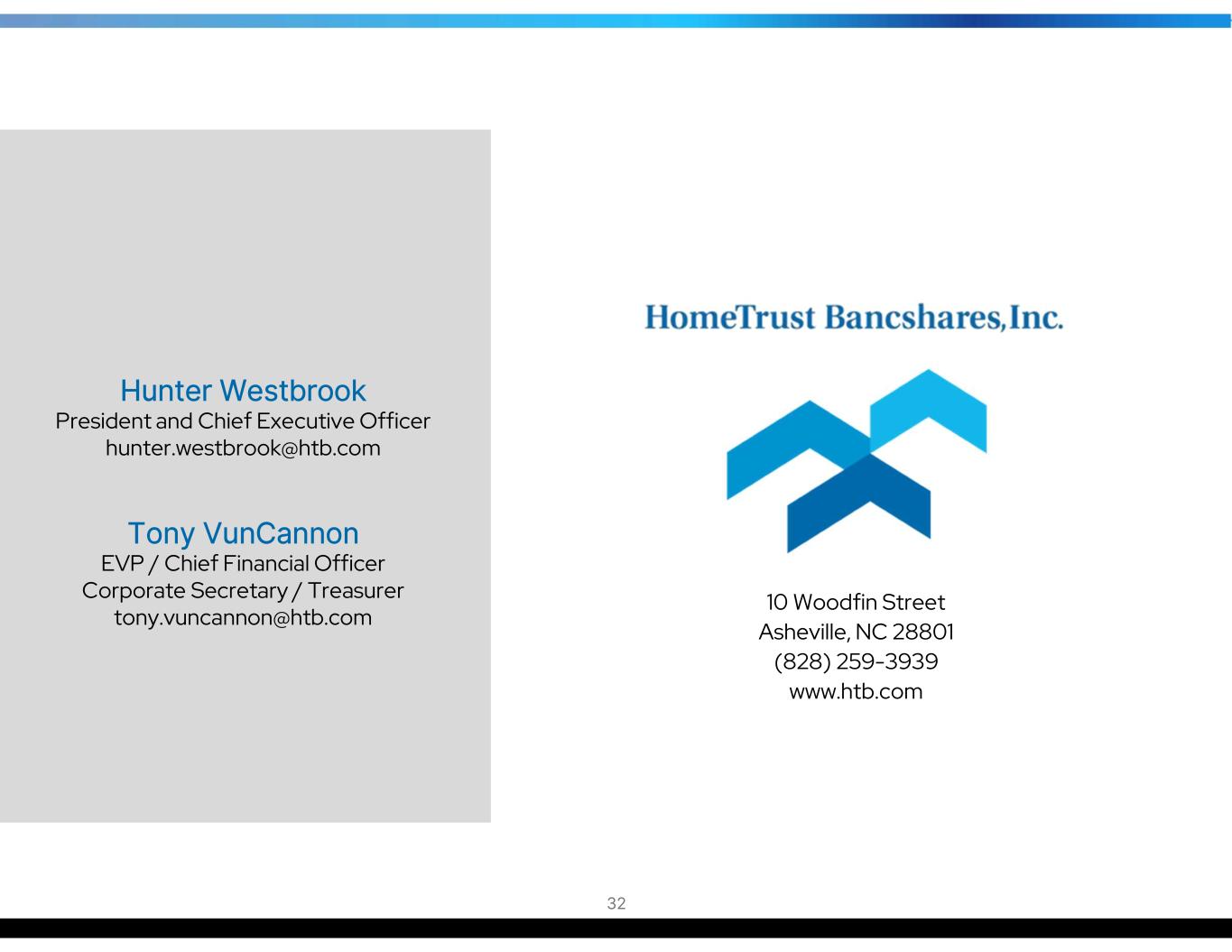 Hunter Westbrook President and Chief Executive Officer hunter.westbrook@htb.com Tony VunCannon EVP / Chief Financial Officer Corporate Secretary / Treasurer tony.vuncannon@htb.com 10 Woodfin Street Asheville, NC 28801 (828) 259-3939 www.htb.com 32