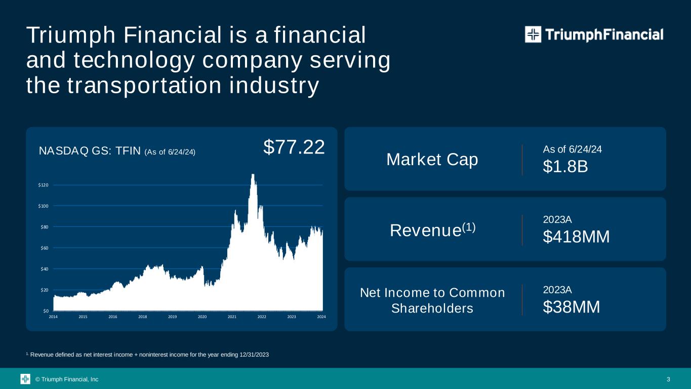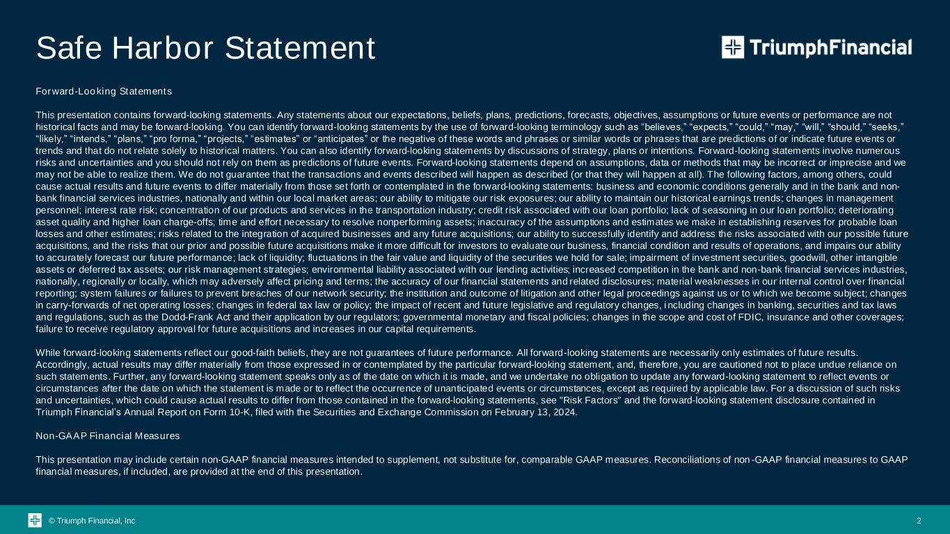 © Triumph Financial, Inc Forward-Looking Statements This presentation contains forward-looking statements. Any statements about our expectations, beliefs, plans, predictions, forecasts, objectives, assumptions or future events or performance are not historical facts and may be forward-looking. You can identify forward-looking statements by the use of forward-looking terminology such as “believes,” “expects,” “could,” “may,” “will,” “should,” “seeks,” “likely,” “intends,” “plans,” “pro forma,” “projects,” “estimates” or “anticipates” or the negative of these words and phrases or similar words or phrases that are predictions of or indicate future events or trends and that do not relate solely to historical matters. You can also identify forward-looking statements by discussions of strategy, plans or intentions. Forward-looking statements involve numerous risks and uncertainties and you should not rely on them as predictions of future events. Forward-looking statements depend on assumptions, data or methods that may be incorrect or imprecise and we may not be able to realize them. We do not guarantee that the transactions and events described will happen as described (or that they will happen at all). The following factors, among others, could cause actual results and future events to differ materially from those set forth or contemplated in the forward-looking statements: business and economic conditions generally and in the bank and non- bank financial services industries, nationally and within our local market areas; our ability to mitigate our risk exposures; our ability to maintain our historical earnings trends; changes in management personnel; interest rate risk; concentration of our products and services in the transportation industry; credit risk associated with our loan portfolio; lack of seasoning in our loan portfolio; deteriorating asset quality and higher loan charge-offs; time and effort necessary to resolve nonperforming assets; inaccuracy of the assumptions and estimates we make in establishing reserves for probable loan losses and other estimates; risks related to the integration of acquired businesses and any future acquisitions; our ability to successfully identify and address the risks associated with our possible future acquisitions, and the risks that our prior and possible future acquisitions make it more difficult for investors to evaluate our business, financial condition and results of operations, and impairs our ability to accurately forecast our future performance; lack of liquidity; fluctuations in the fair value and liquidity of the securities we hold for sale; impairment of investment securities, goodwill, other intangible assets or deferred tax assets; our risk management strategies; environmental liability associated with our lending activities; increased competition in the bank and non-bank financial services industries, nationally, regionally or locally, which may adversely affect pricing and terms; the accuracy of our financial statements and related disclosures; material weaknesses in our internal control over financial reporting; system failures or failures to prevent breaches of our network security; the institution and outcome of litigation and other legal proceedings against us or to which we become subject; changes in carry-forwards of net operating losses; changes in federal tax law or policy; the impact of recent and future legislative and regulatory changes, i ncluding changes in banking, securities and tax laws and regulations, such as the Dodd-Frank Act and their application by our regulators; governmental monetary and fiscal policies; changes in the scope and cost of FDIC, insurance and other coverages; failure to receive regulatory approval for future acquisitions and increases in our capital requirements. While forward-looking statements reflect our good-faith beliefs, they are not guarantees of future performance. All forward-looking statements are necessarily only estimates of future results. Accordingly, actual results may differ materially from those expressed in or contemplated by the particular forward-looking statement, and, therefore, you are cautioned not to place undue reliance on such statements. Further, any forward-looking statement speaks only as of the date on which it is made, and we undertake no obligation to update any forward-looking statement to reflect events or circumstances after the date on which the statement is made or to reflect the occurrence of unanticipated events or circumstances, except as required by applicable law. For a discussion of such risks and uncertainties, which could cause actual results to differ from those contained in the forward-looking statements, see "Risk Factors" and the forward-looking statement disclosure contained in Triumph Financial’s Annual Report on Form 10-K, filed with the Securities and Exchange Commission on February 13, 2024. Non-GAAP Financial Measures This presentation may include certain non‐GAAP financial measures intended to supplement, not substitute for, comparable GAAP measures. Reconciliations of non ‐GAAP financial measures to GAAP financial measures, if included, are provided at the end of this presentation. Safe Harbor Statement 2