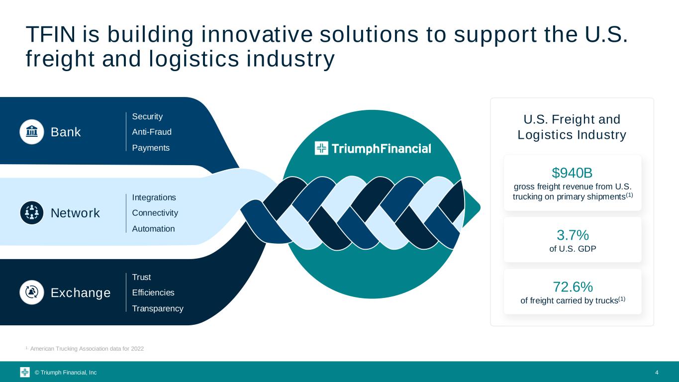 © Triumph Financial, Inc NASDAQ GS: TFIN (As of 6/24/24) $77.22 $0 $20 $40 $60 $80 $100 $120 2014 2015 2016 2018 2019 2020 2021 2022 2023 2024 Market Cap Revenue(1) Net Income to Common Shareholders Triumph Financial is a financial and technology company serving the transportation industry 2023A $38MM 2023A $418MM As of 6/24/24 $1.8B 3 1. Revenue defined as net interest income + noninterest income for the year ending 12/31/2023