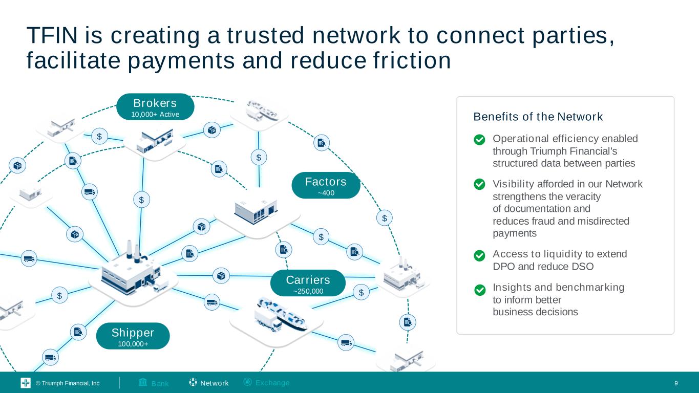 © Triumph Financial, Inc Many Many Many Many Complexity invites fraud and creates waste Fraud $500MM-$700MM in double-brokering fraud estimated and growing(1) Theft 57% increase in cargo theft incidents in 2023 compared to 2022(2) Friction ~$20 per invoice in friction incurred by the broker factor and shipper(1) ! ! ! Challenges of Fragmentation 1. Internal estimate from TriumphPay data 2. CNBC 2024, “Cargo theft spiked over 57% in 2023 vs. 2022, new data shows” $ values presented are annualized un less otherwise stated $550B+ Total transactions among fragmented stakeholders Brokers 10,000+ Active $ $ $ $ $ $ Shipper 100,000+ Factors ~400 Carriers ~250,000 $ Network ExchangeBank 8