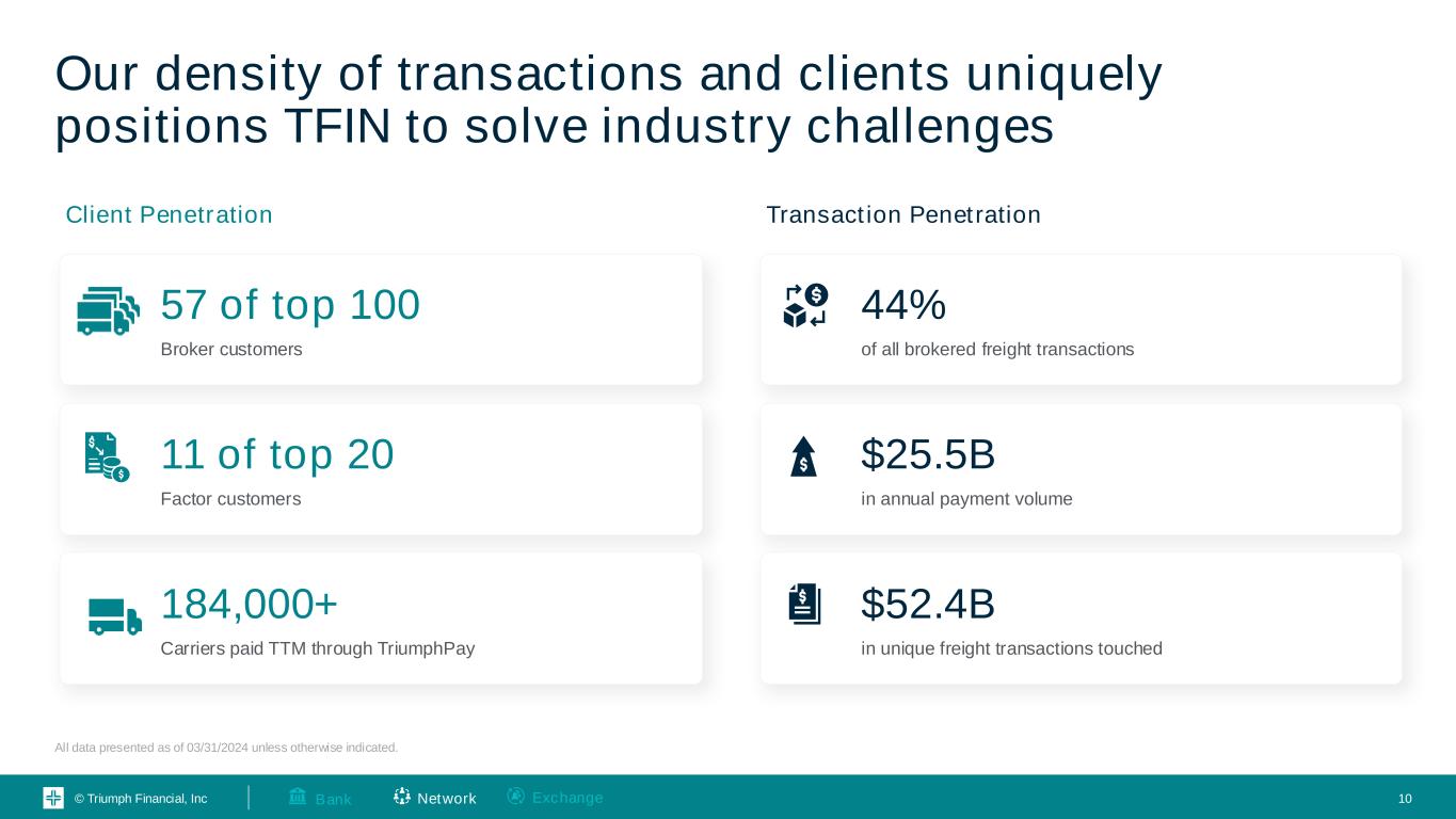 © Triumph Financial, Inc TFIN is creating a trusted network to connect parties, facilitate payments and reduce friction Shipper 100,000+ Factors ~400 Brokers 10,000+ Active Operational efficiency enabled through Triumph Financial's structured data between parties Visibility afforded in our Network strengthens the veracity of documentation and reduces fraud and misdirected payments Access to liquidity to extend DPO and reduce DSO Insights and benchmarking to inform better business decisions Benefits of the Network $ $ $ $ $ $ $ Carriers ~250,000 Network ExchangeBank 9