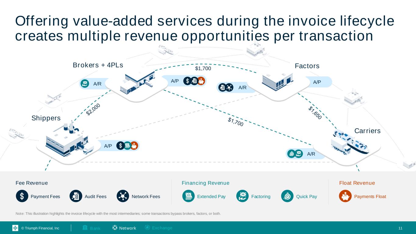 © Triumph Financial, Inc Our density of transactions and clients uniquely positions TFIN to solve industry challenges Client Penetration 57 of top 100 Broker customers 11 of top 20 Factor customers 184,000+ Carriers paid TTM through TriumphPay Transaction Penetration 44% of all brokered freight transactions $25.5B in annual payment volume $52.4B in unique freight transactions touched Network ExchangeBank 10 All data presented as of 03/31/2024 unless otherwise indicated.