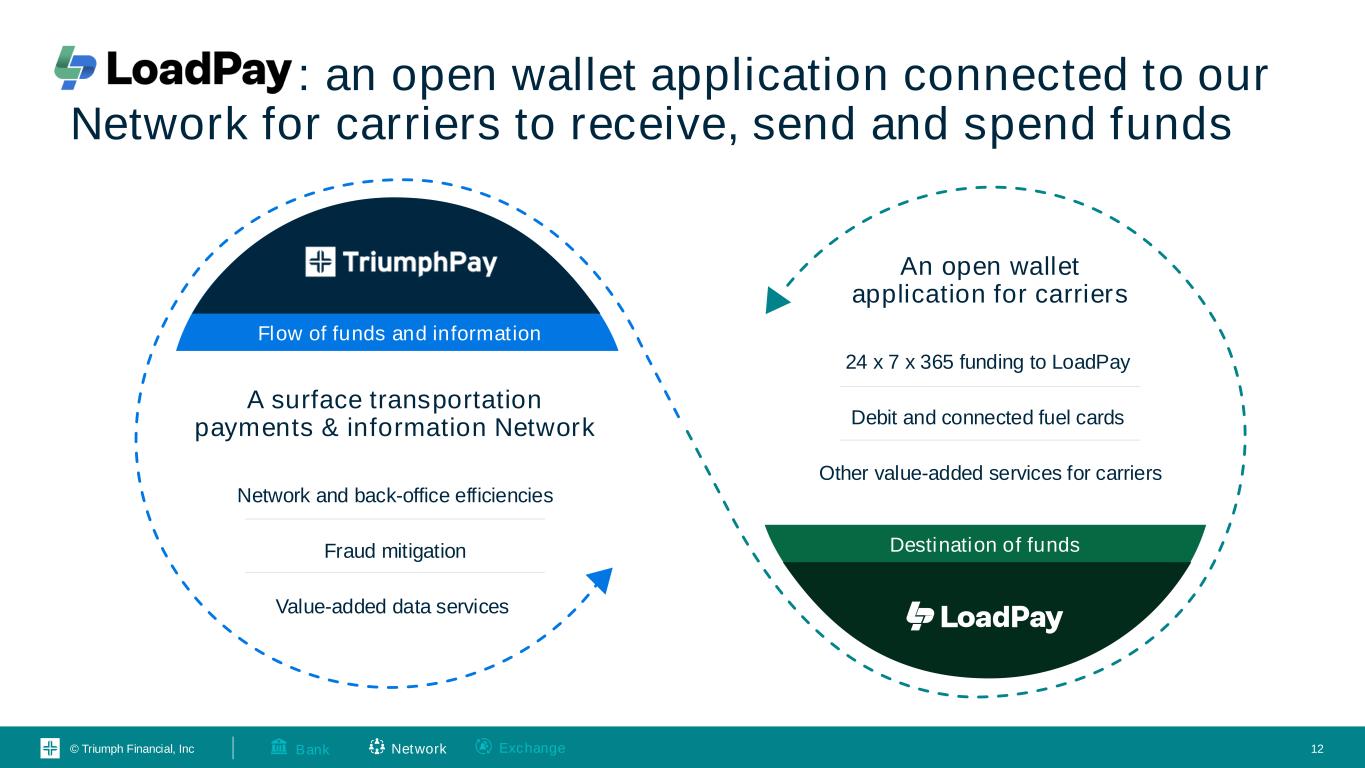 © Triumph Financial, Inc A/R $1,700 Fee Revenue Financing Revenue Float Revenue A/P A/R A/P A/R A/P Offering value-added services during the invoice lifecycle creates multiple revenue opportunities per transaction 11 Factors Carriers Brokers + 4PLs Shippers Note: This illustration highlights the invoice lifecycle with the most intermediaries; some transactions bypass brokers, factors, or both. Quick PayAudit Fees Network FeesPayment Fees Extended Pay Factoring Payments Float 11Network ExchangeBank