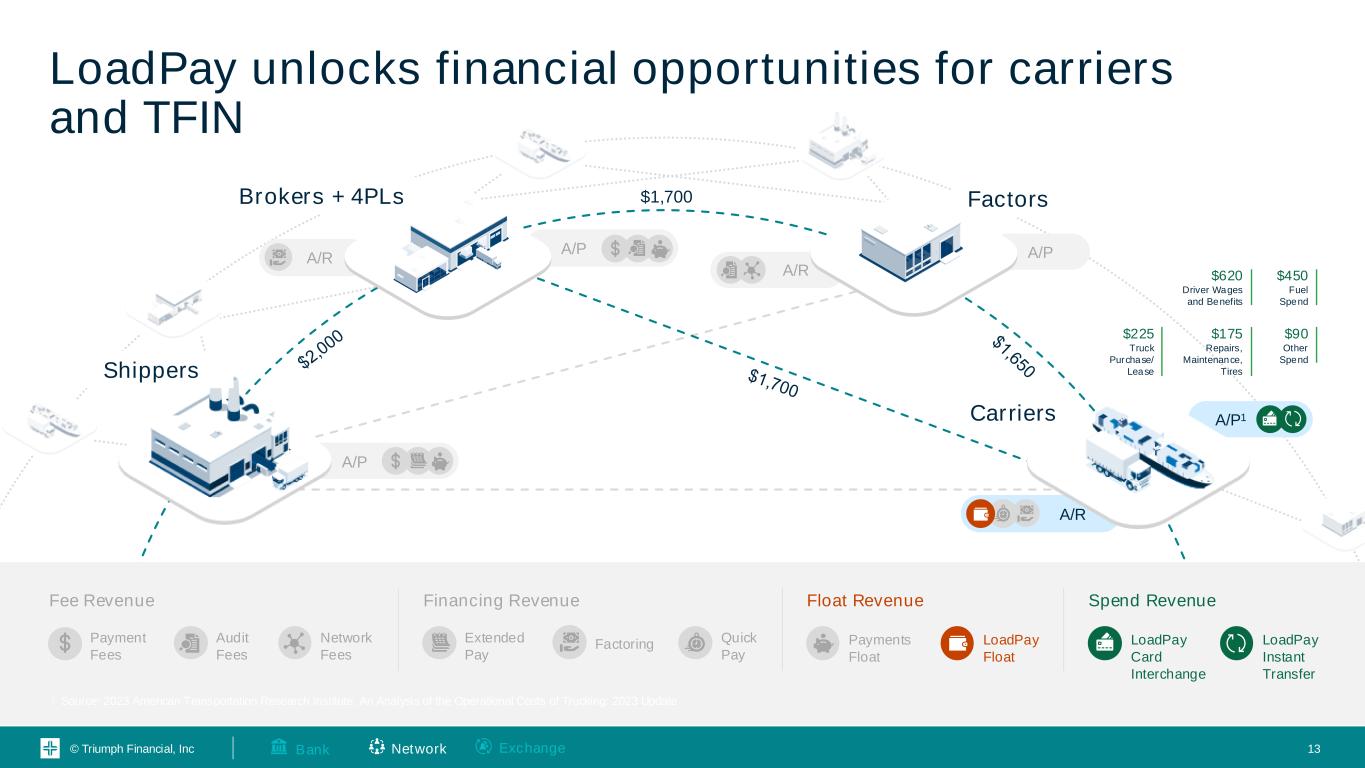 © Triumph Financial, Inc : an open wallet application connected to our Network for carriers to receive, send and spend funds 12 A surface transportation payments & information Network Network and back-office efficiencies Fraud mitigation Value-added data services An open wallet application for carriers 24 x 7 x 365 funding to LoadPay Debit and connected fuel cards Other value-added services for carriers Flow of funds and information Destination of funds Network ExchangeBank