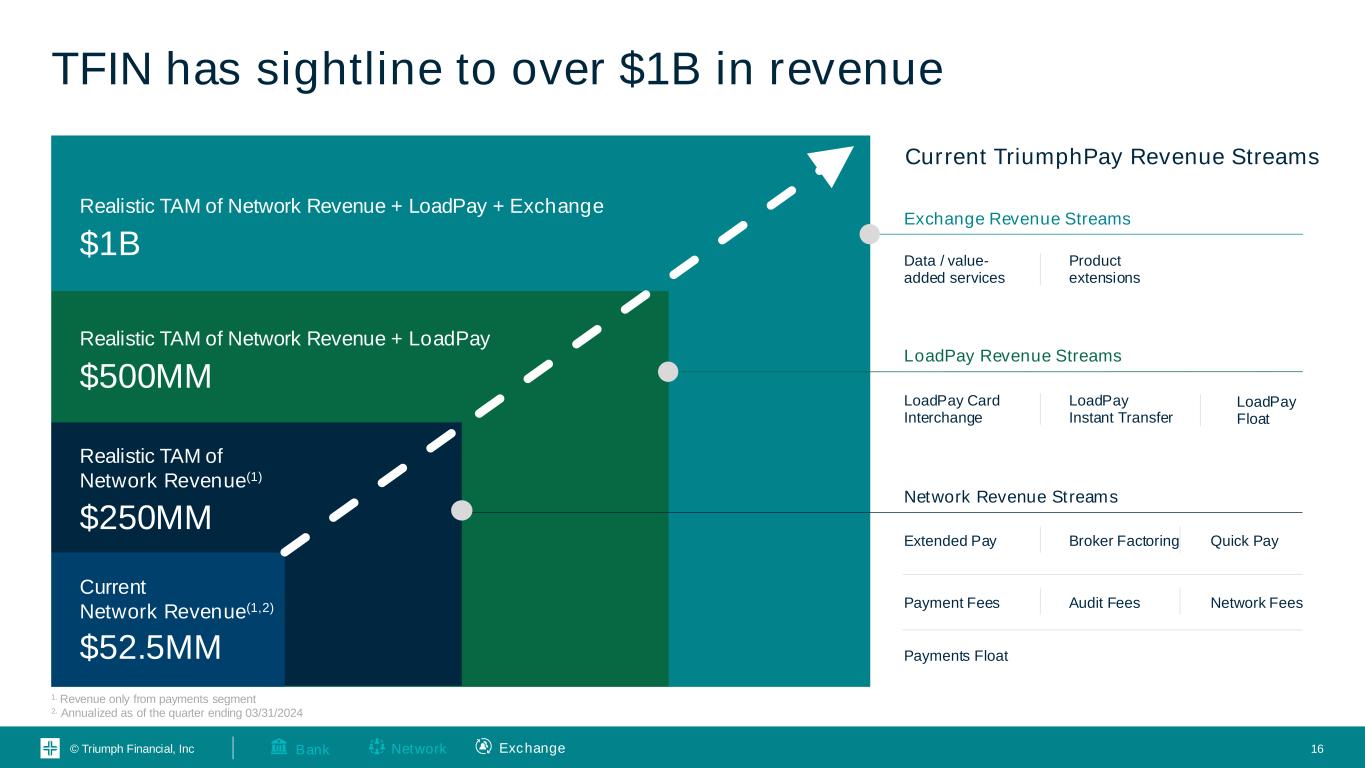© Triumph Financial, Inc TFIN could leverage our Network density to facilitate a trusted exchange 15 Financial Institutions Equipment Finance Lenders Investment Firms Government Agencies Insurance Groups Who would have access to the Exchange? Vetted members of our Network What could flow through the Exchange? Data Payments Financing Syndication Insurance Indexes Network ExchangeBank