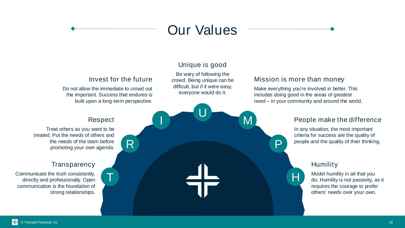 © Triumph Financial, Inc T R I U M P H Transparency Communicate the truth consistently, directly and professionally. Open communication is the foundation of strong relationships. Respect Treat others as you want to be treated. Put the needs of others and the needs of the team before promoting your own agenda. Invest for the future Do not allow the immediate to crowd out the important. Success that endures is built upon a long-term perspective. Unique is good Be wary of following the crowd. Being unique can be difficult, but if it were easy, everyone would do it. Mission is more than money Make everything you're involved in better. This includes doing good in the areas of greatest need – in your community and around the world. People make the difference In any situation, the most important criteria for success are the quality of people and the quality of their thinking. Humility Model humility in all that you do. Humility is not passivity, as it requires the courage to prefer others' needs over your own. Our Values 18