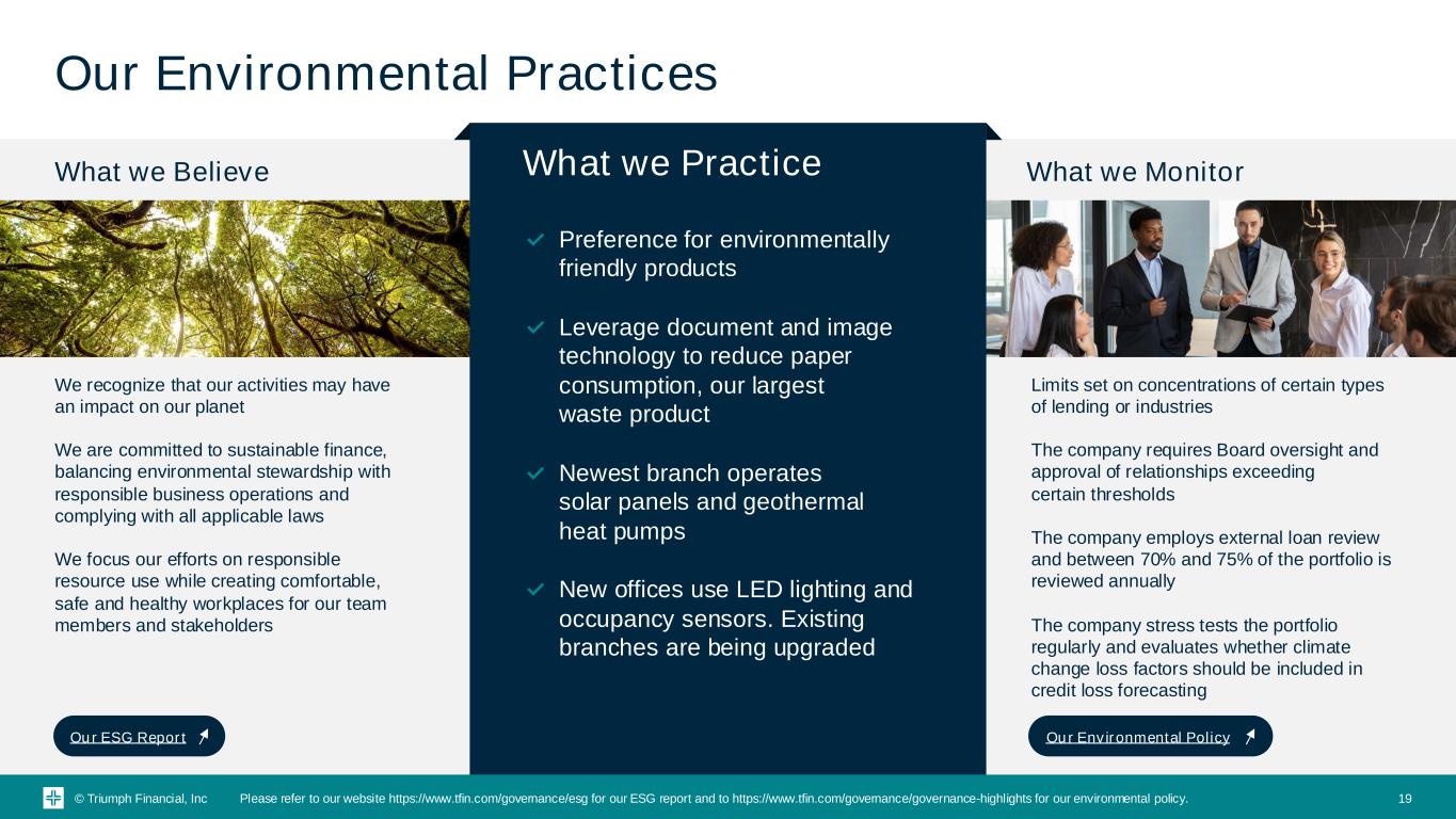 © Triumph Financial, Inc Our Environmental Practices What we Believe What we Monitor We recognize that our activities may have an impact on our planet We are committed to sustainable finance, balancing environmental stewardship with responsible business operations and complying with all applicable laws We focus our efforts on responsible resource use while creating comfortable, safe and healthy workplaces for our team members and stakeholders Limits set on concentrations of certain types of lending or industries The company requires Board oversight and approval of relationships exceeding certain thresholds The company employs external loan review and between 70% and 75% of the portfolio is reviewed annually The company stress tests the portfolio regularly and evaluates whether climate change loss factors should be included in credit loss forecasting Our ESG Report Our Environmental Policy What we Practice ✓ Preference for environmentally friendly products ✓ Leverage document and image technology to reduce paper consumption, our largest waste product ✓ Newest branch operates solar panels and geothermal heat pumps ✓ New offices use LED lighting and occupancy sensors. Existing branches are being upgraded 19Please refer to our website https://www.tfin.com/governance/esg for our ESG report and to https://www.tfin.com/governance/governance-highlights for our environmental policy.