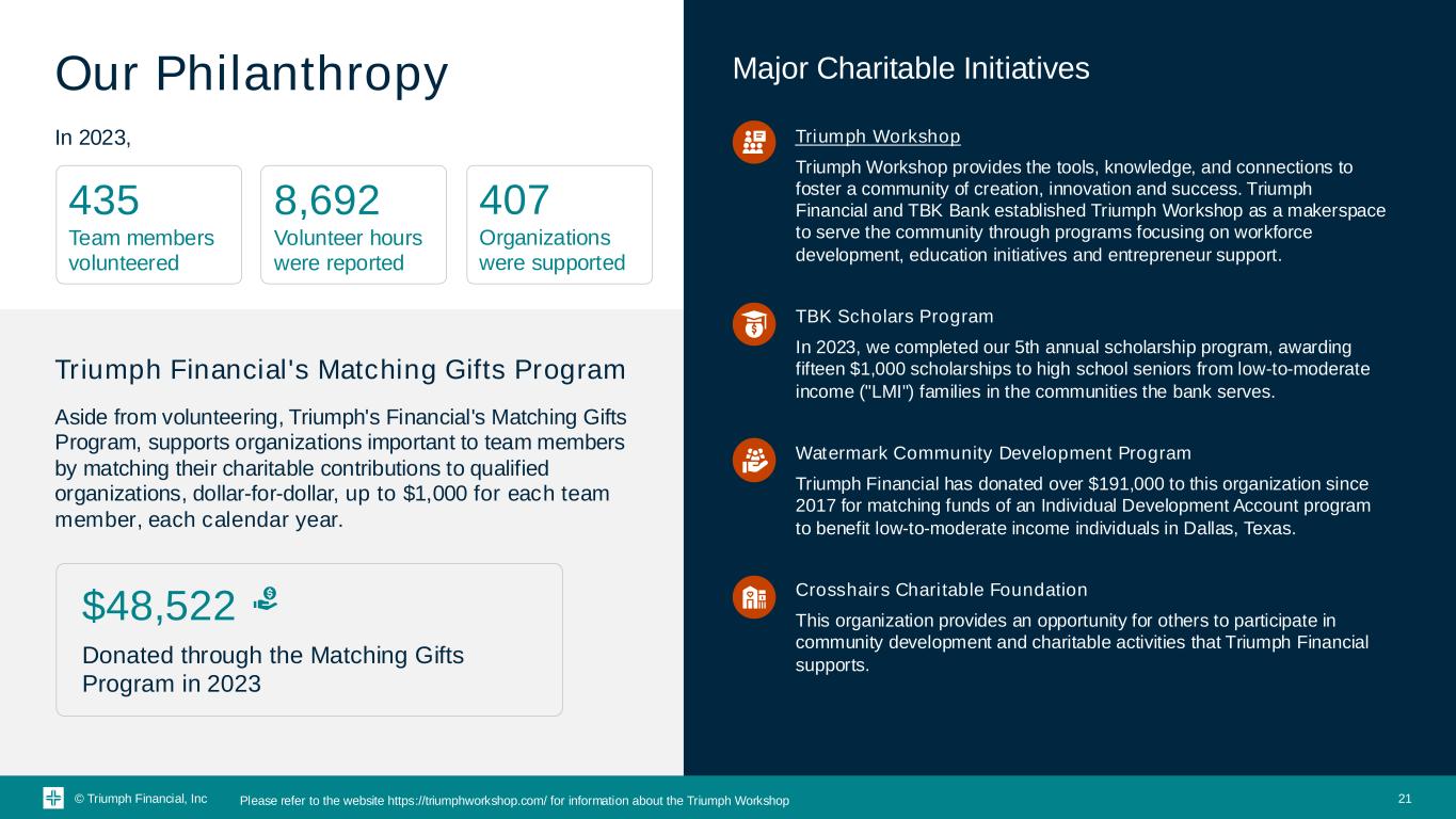 © Triumph Financial, Inc Our Philanthropy In 2023, Triumph Financial's Matching Gifts Program Aside from volunteering, Triumph's Financial's Matching Gifts Program, supports organizations important to team members by matching their charitable contributions to qualified organizations, dollar-for-dollar, up to $1,000 for each team member, each calendar year. 21 435 Team members volunteered 8,692 Volunteer hours were reported 407 Organizations were supported $48,522 Donated through the Matching Gifts Program in 2023 Major Charitable Initiatives Triumph Workshop Triumph Workshop provides the tools, knowledge, and connections to foster a community of creation, innovation and success. Triumph Financial and TBK Bank established Triumph Workshop as a makerspace to serve the community through programs focusing on workforce development, education initiatives and entrepreneur support. TBK Scholars Program In 2023, we completed our 5th annual scholarship program, awarding fifteen $1,000 scholarships to high school seniors from low-to-moderate income ("LMI") families in the communities the bank serves. Watermark Community Development Program Triumph Financial has donated over $191,000 to this organization since 2017 for matching funds of an Individual Development Account program to benefit low-to-moderate income individuals in Dallas, Texas. Crosshairs Charitable Foundation This organization provides an opportunity for others to participate in community development and charitable activities that Triumph Financial supports. Please refer to the website https://triumphworkshop.com/ for information about the Triumph Workshop