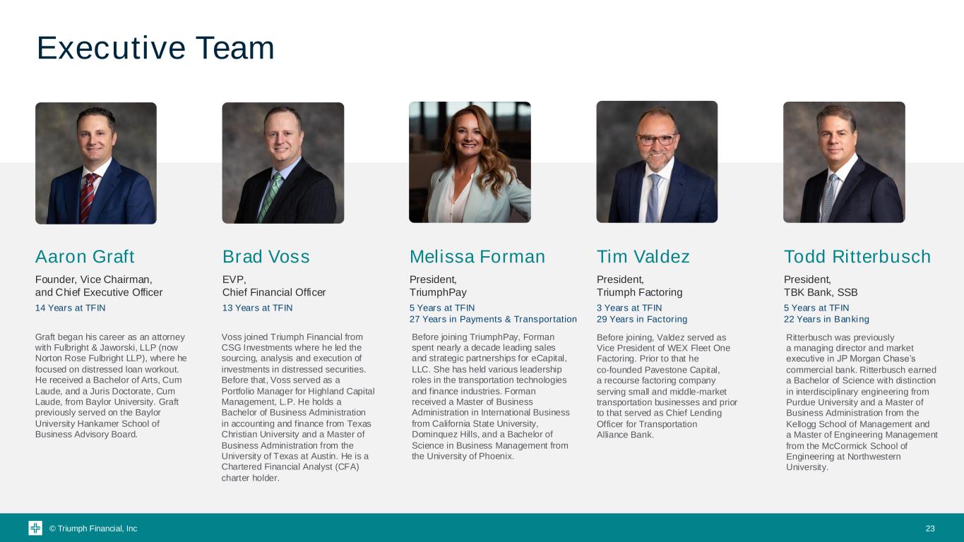 © Triumph Financial, Inc Executive Team Aaron Graft Founder, Vice Chairman, and Chief Executive Officer 14 Years at TFIN Brad Voss EVP, Chief Financial Officer 13 Years at TFIN Melissa Forman President, TriumphPay 5 Years at TFIN 27 Years in Payments & Transportation Tim Valdez President, Triumph Factoring 3 Years at TFIN 29 Years in Factoring Todd Ritterbusch President, TBK Bank, SSB 5 Years at TFIN 22 Years in Banking Graft began his career as an attorney with Fulbright & Jaworski, LLP (now Norton Rose Fulbright LLP), where he focused on distressed loan workout. He received a Bachelor of Arts, Cum Laude, and a Juris Doctorate, Cum Laude, from Baylor University. Graft previously served on the Baylor University Hankamer School of Business Advisory Board. Voss joined Triumph Financial from CSG Investments where he led the sourcing, analysis and execution of investments in distressed securities. Before that, Voss served as a Portfolio Manager for Highland Capital Management, L.P. He holds a Bachelor of Business Administration in accounting and finance from Texas Christian University and a Master of Business Administration from the University of Texas at Austin. He is a Chartered Financial Analyst (CFA) charter holder. Before joining TriumphPay, Forman spent nearly a decade leading sales and strategic partnerships for eCapital, LLC. She has held various leadership roles in the transportation technologies and finance industries. Forman received a Master of Business Administration in International Business from California State University, Dominquez Hills, and a Bachelor of Science in Business Management from the University of Phoenix. Before joining, Valdez served as Vice President of WEX Fleet One Factoring. Prior to that he co-founded Pavestone Capital, a recourse factoring company serving small and middle-market transportation businesses and prior to that served as Chief Lending Officer for Transportation Alliance Bank. Ritterbusch was previously a managing director and market executive in JP Morgan Chase’s commercial bank. Ritterbusch earned a Bachelor of Science with distinction in interdisciplinary engineering from Purdue University and a Master of Business Administration from the Kellogg School of Management and a Master of Engineering Management from the McCormick School of Engineering at Northwestern University. 23