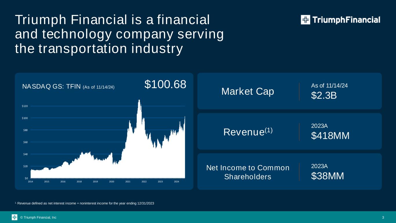 © Triumph Financial, Inc Forward-Looking Statements This presentation contains forward-looking statements. Any statements about our expectations, beliefs, plans, predictions, forecasts, objectives, assumptions or future events or performance are not historical facts and may be forward-looking. You can identify forward-looking statements by the use of forward-looking terminology such as “believes,” “expects,” “could,” “may,” “will,” “should,” “seeks,” “likely,” “intends,” “plans,” “pro forma,” “projects,” “estimates” or “anticipates” or the negative of these words and phrases or similar words or phrases that are predictions of or indicate future events or trends and that do not relate solely to historical matters. You can also identify forward-looking statements by discussions of strategy, plans or intentions. Forward-looking statements involve numerous risks and uncertainties and you should not rely on them as predictions of future events. Forward-looking statements depend on assumptions, data or methods that may be incorrect or imprecise and we may not be able to realize them. We do not guarantee that the transactions and events described will happen as described (or that they will happen at all). The following factors, among others, could cause actual results and future events to differ materially from those set forth or contemplated in the forward-looking statements: business and economic conditions generally and in the bank and non- bank financial services industries, nationally and within our local market areas; our ability to mitigate our risk exposures; our ability to maintain our historical earnings trends; changes in management personnel; interest rate risk; concentration of our products and services in the transportation industry; credit risk associated with our loan portfolio; lack of seasoning in our loan portfolio; deteriorating asset quality and higher loan charge-offs; time and effort necessary to resolve nonperforming assets; inaccuracy of the assumptions and estimates we make in establishing reserves for probable loan losses and other estimates; risks related to the integration of acquired businesses and any future acquisitions; our ability to successfully identify and address the risks associated with our possible future acquisitions, and the risks that our prior and possible future acquisitions make it more difficult for investors to evaluate our business, financial condition and results of operations, and impairs our ability to accurately forecast our future performance; lack of liquidity; fluctuations in the fair value and liquidity of the securities we hold for sale; impairment of investment securities, goodwill, other intangible assets or deferred tax assets; our risk management strategies; environmental liability associated with our lending activities; increased competition in the bank and non-bank financial services industries, nationally, regionally or locally, which may adversely affect pricing and terms; the accuracy of our financial statements and related disclosures; material weaknesses in our internal control over financial reporting; system failures or failures to prevent breaches of our network security; the institution and outcome of litigation and other legal proceedings against us or to which we become subject; changes in carry-forwards of net operating losses; changes in federal tax law or policy; the impact of recent and future legislative and regulatory changes, including changes in banking, securities and tax laws and regulations, such as the Dodd-Frank Act and their application by our regulators; governmental monetary and fiscal policies; changes in the scope and cost of FDIC, insurance and other coverages; failure to receive regulatory approval for future acquisitions and increases in our capital requirements. While forward-looking statements reflect our good-faith beliefs, they are not guarantees of future performance. All forward-looking statements are necessarily only estimates of future results. Accordingly, actual results may differ materially from those expressed in or contemplated by the particular forward-looking statement, and, therefore, you are cautioned not to place undue reliance on such statements. Further, any forward-looking statement speaks only as of the date on which it is made, and we undertake no obligation to update any forward-looking statement to reflect events or circumstances after the date on which the statement is made or to reflect the occurrence of unanticipated events or circumstances, except as required by applicable law. For a discussion of such risks and uncertainties, which could cause actual results to differ from those contained in the forward-looking statements, see "Risk Factors" and the forward-looking statement disclosure contained in Triumph Financial’s Annual Report on Form 10-K, filed with the Securities and Exchange Commission on February 13, 2024. Non-GAAP Financial Measures This presentation may include certain non‐GAAP financial measures intended to supplement, not substitute for, comparable GAAP measures. Reconciliations of non ‐GAAP financial measures to GAAP financial measures, if included, are provided at the end of this presentation. Safe Harbor Statement 2