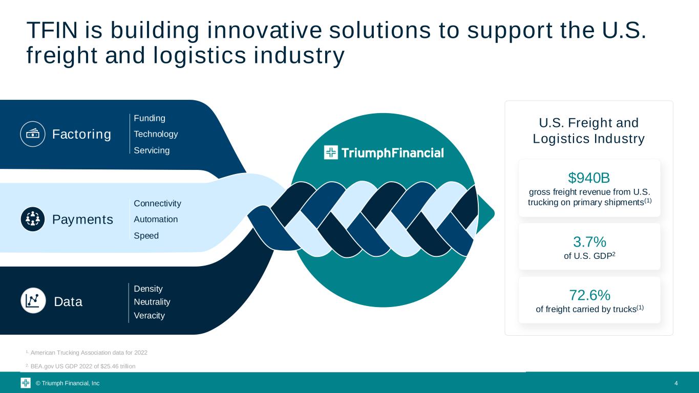© Triumph Financial, Inc NASDAQ GS: TFIN (As of 11/14/24) $100.68 $0 $20 $40 $60 $80 $100 $120 2014 2015 2016 2018 2019 2020 2021 2022 2023 2024 Market Cap Revenue(1) Net Income to Common Shareholders Triumph Financial is a financial and technology company serving the transportation industry 2023A $38MM 2023A $418MM As of 11/14/24 $2.3B 3 1. Revenue defined as net interest income + noninterest income for the year ending 12/31/2023