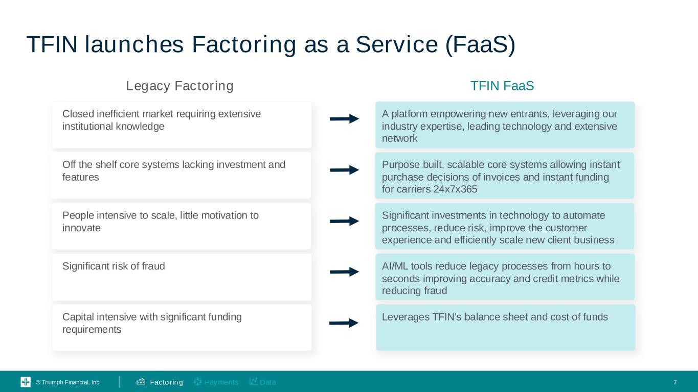 © Triumph Financial, Inc TFIN is a leading factor in the transportation industry 6 #2 transportation factor in North America $10B+ in transportation accounts receivable purchased over last 12 months 46.1% pre-tax operating margin1 ~1.4% Per Invoice Fee2 Days to Collect2 ~35 days Portfolio Turn2 Yield on NFE3,4 ~10.4x Annually ~17.0% Average Discount Rate Factoring Highlights Net Charge-offs to Average Receivables Balances3 0.34% Payments DataFactoring 1. Pre-tax operating margin, defined as Pre-Tax Operating Income / (Net Interest Income + Noninterest Income) in the factoring segment, shown over the years 2021 through 3Q2024. Specifically: 2021 (57.2%), 2022 (55.0%), 2023 (27.4%) and YTD 2024 (23.4%) representing the impact of the peak post pandemic and subsequent freight recession trends. 2. Data as of 09/30/2024 3. Data as of YTD 9/30/2024. 4. Net funds employed equal the accounts receivable balance less any reserves and unpaid fees held against the account.